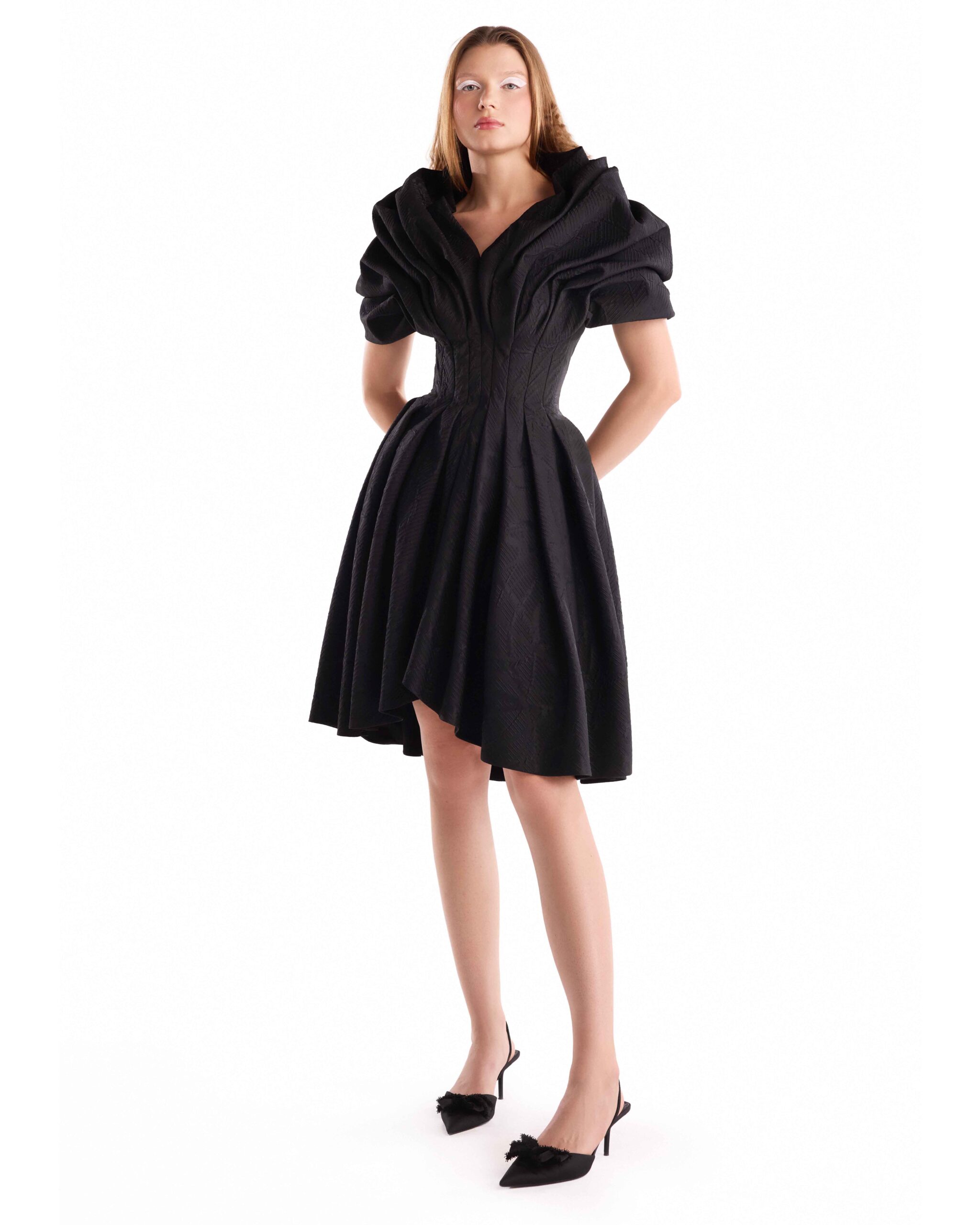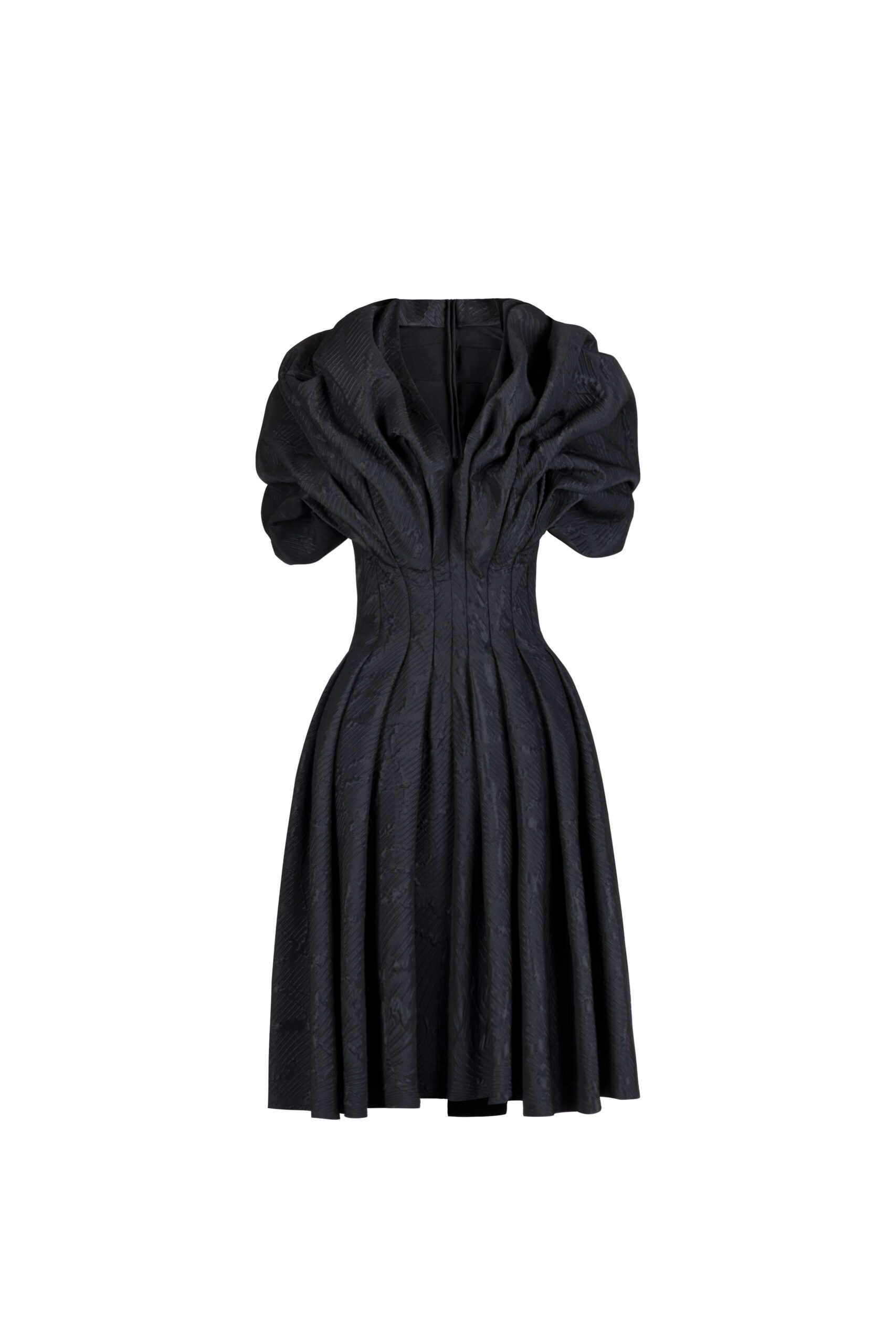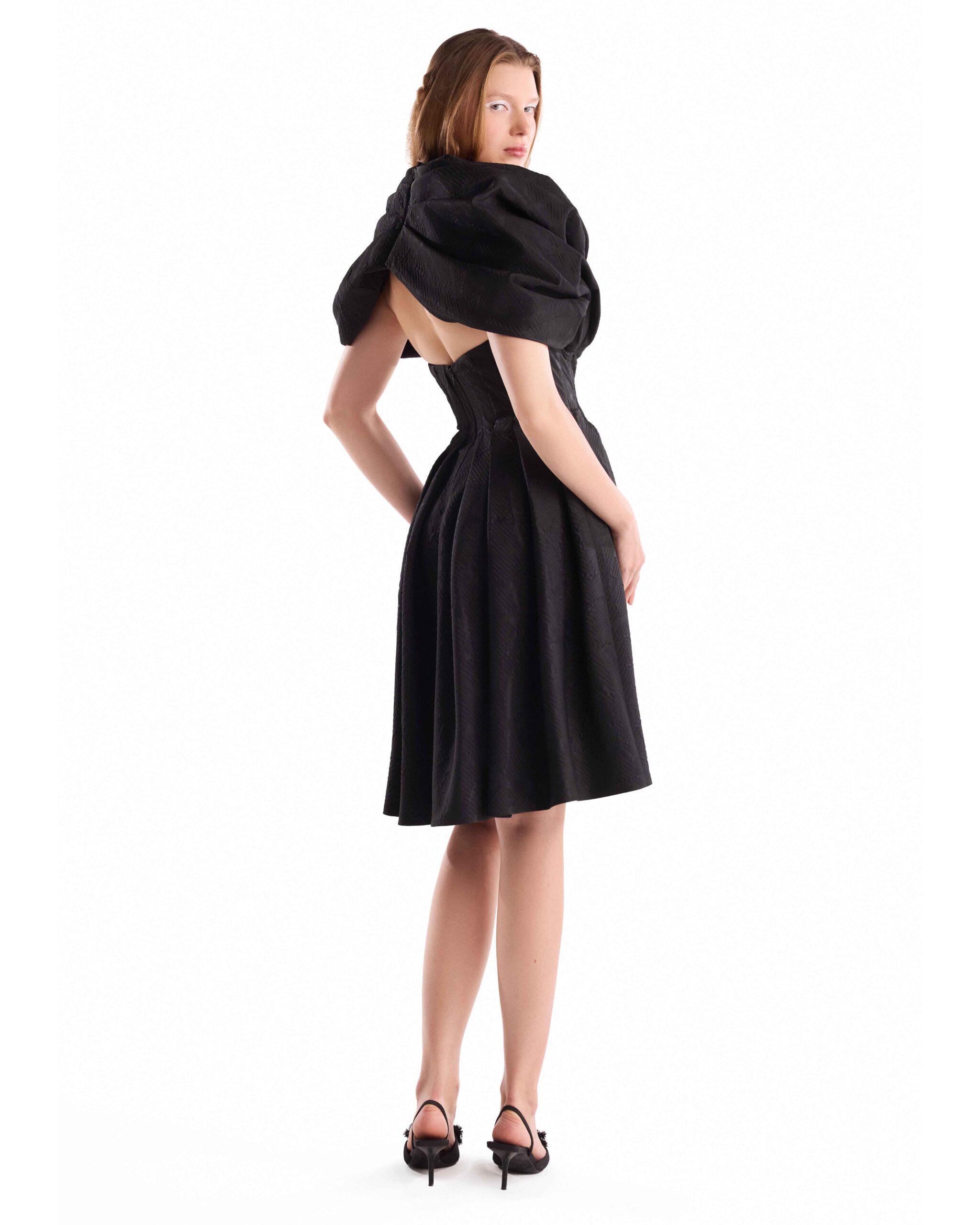 Black jacquard dress featuring a halter-style sculpted neckline with off-shoulder effect, a defined waist, and an asymmetric flared skirt.