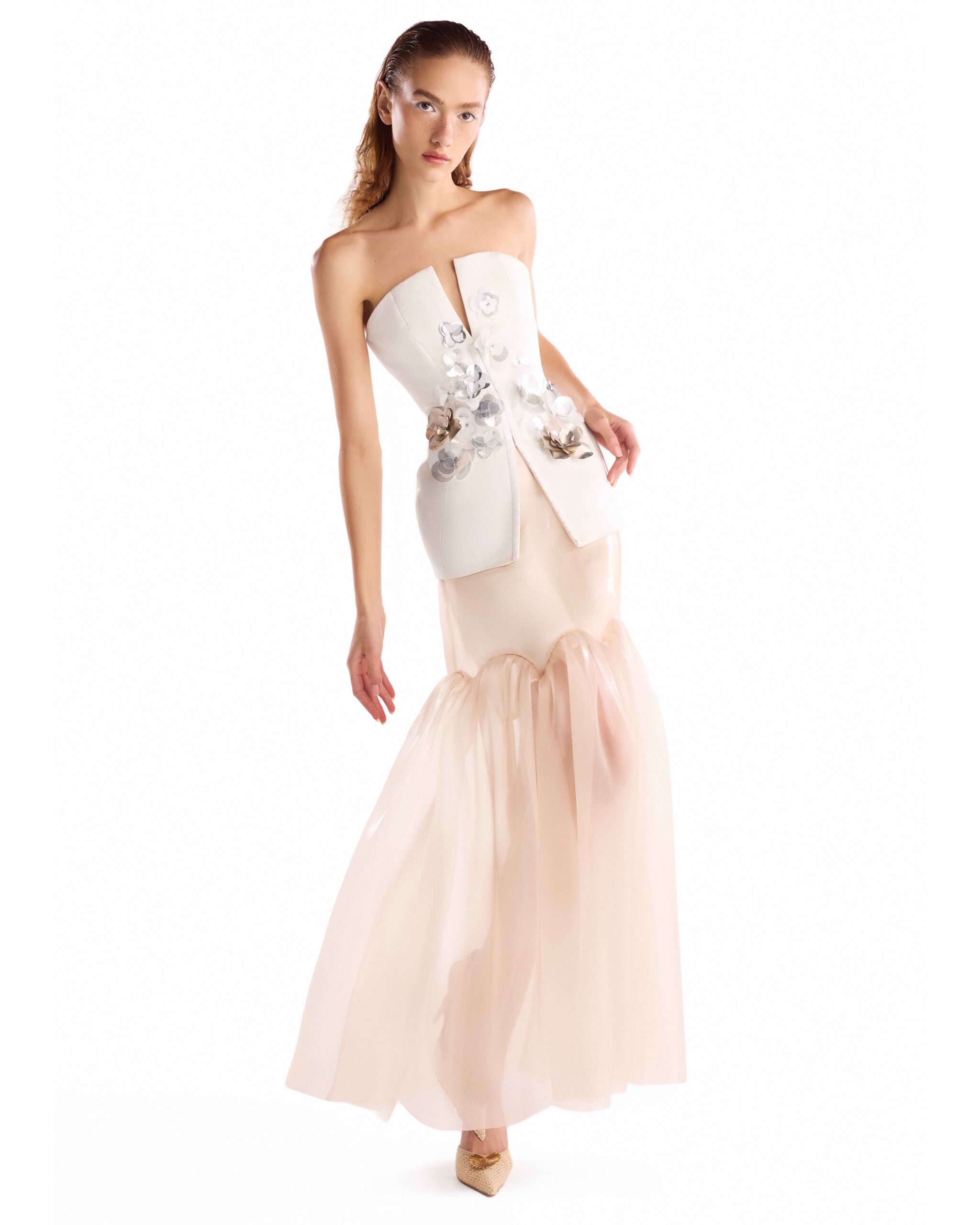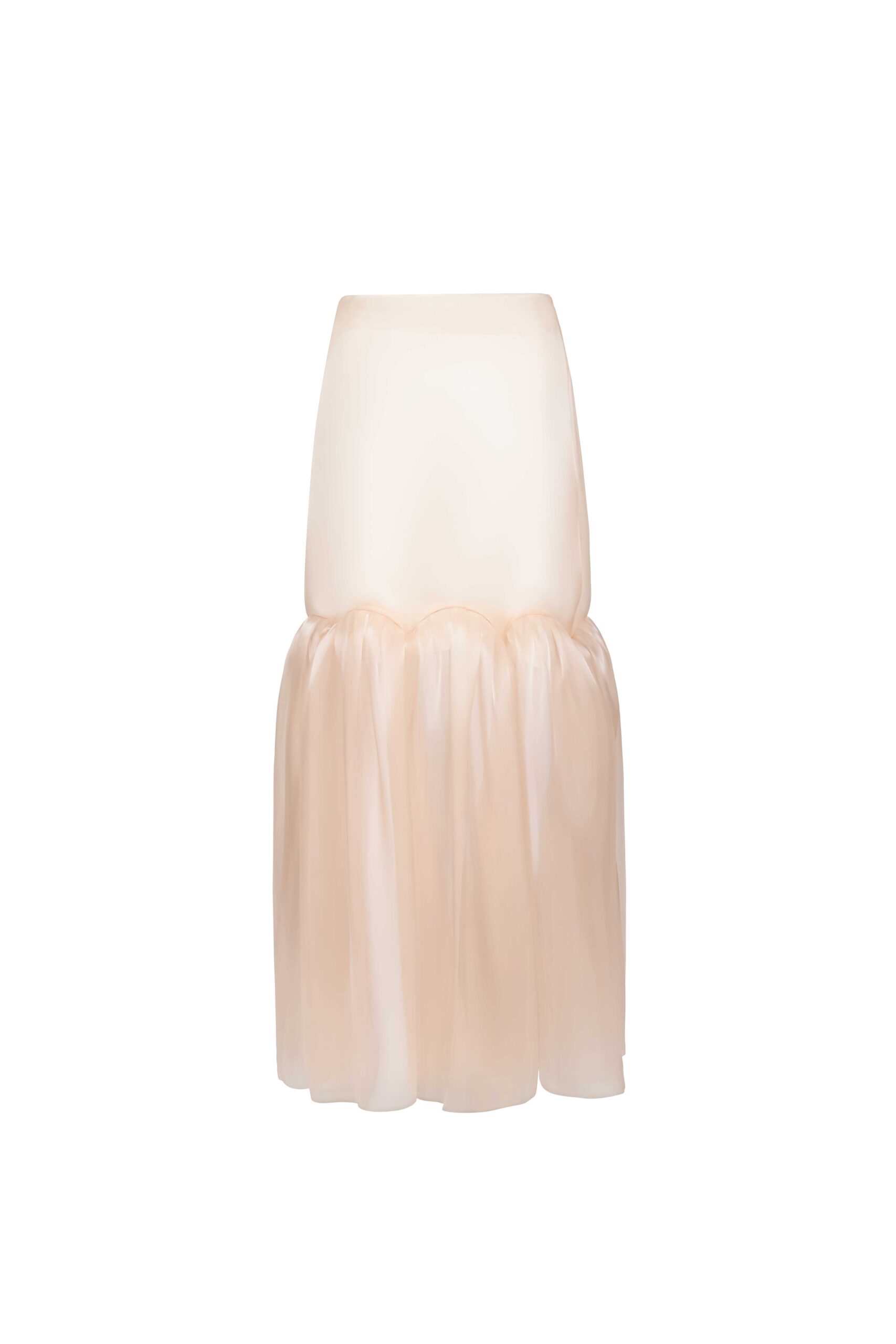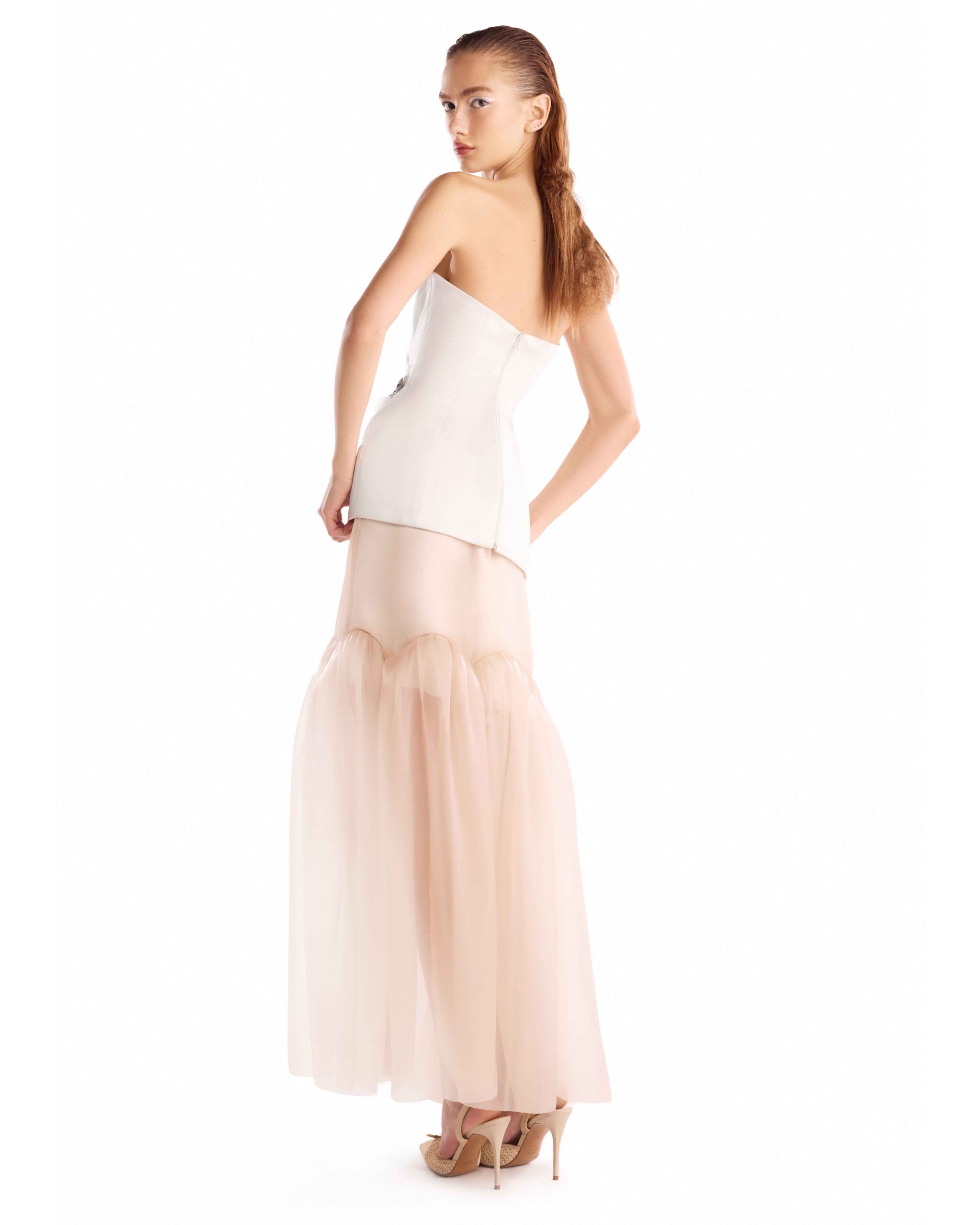 Razmir skirt with a fluid organza clouded hem ruffle, offering volume, movement, and softness.