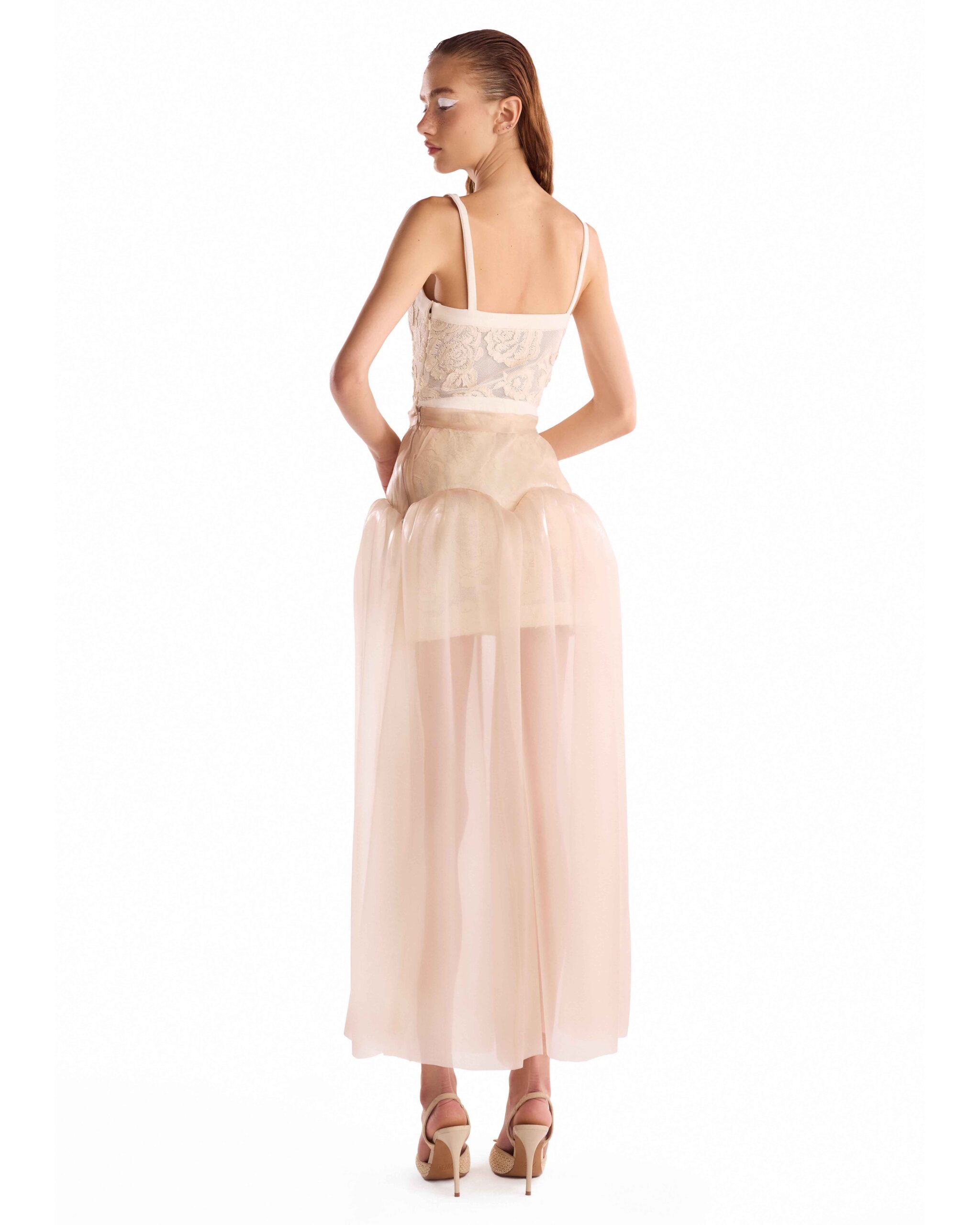 Fitted creamy brocard dress complemented by a removable liquid organza overskirt for versatile, elevated elegance.