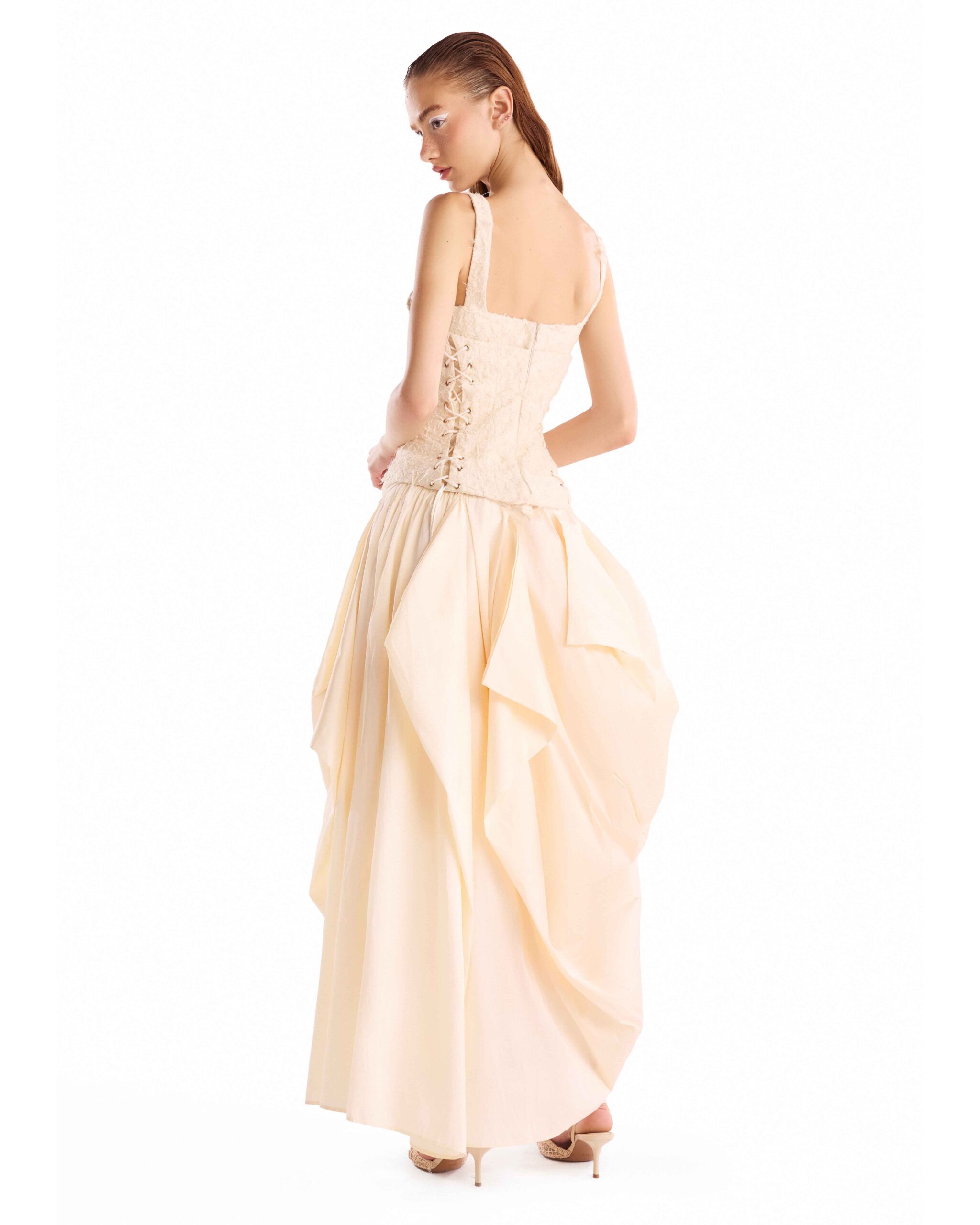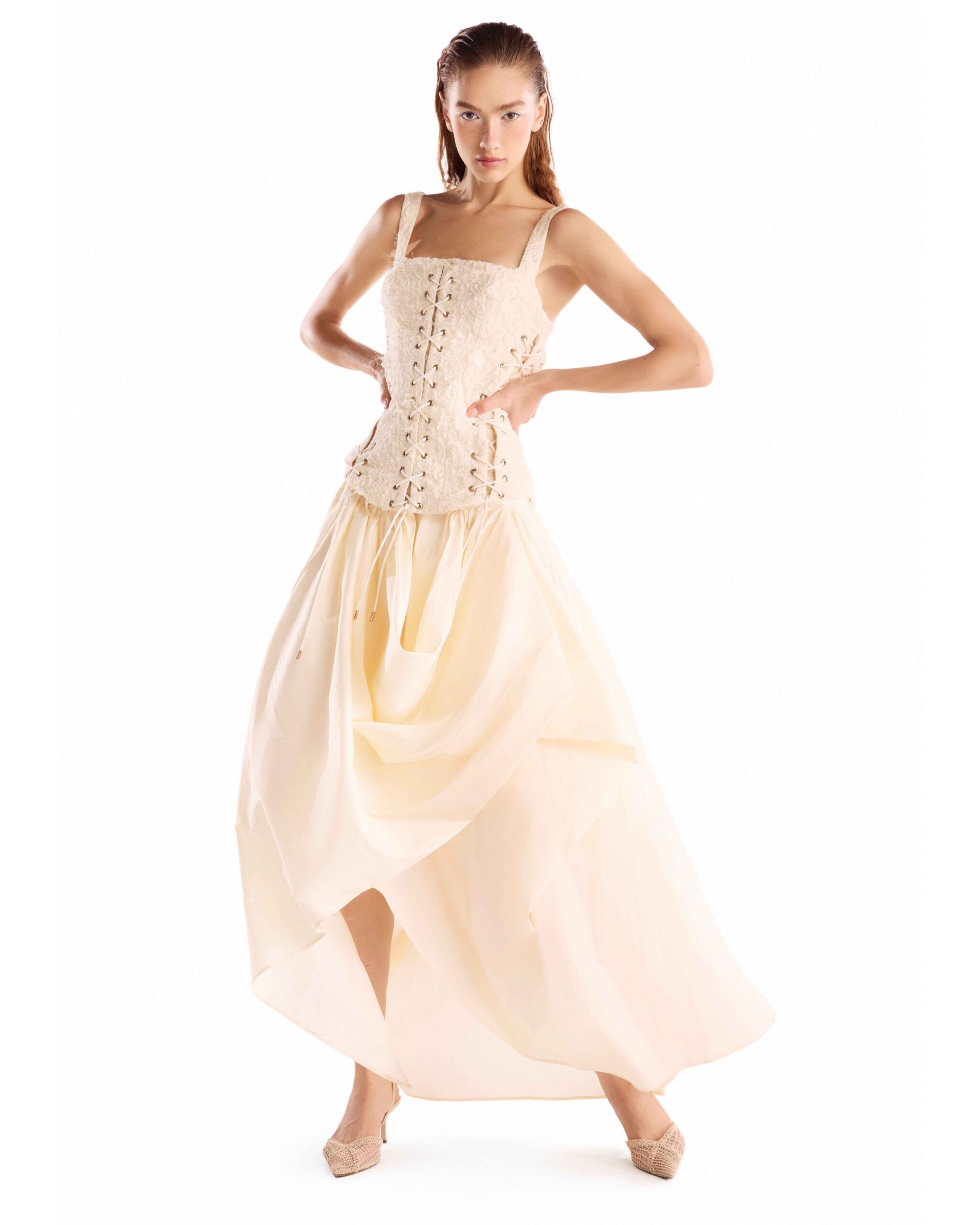 Corseted jacquard bodice paired with a fluid creamy taffeta skirt, designed for sculpted elegance and effortless movement.
