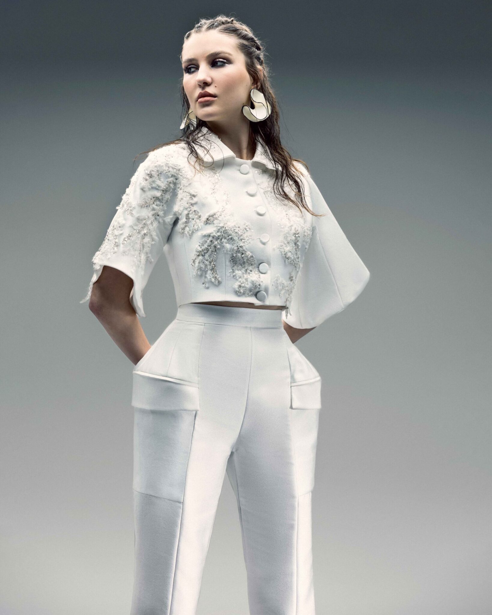 An Exquisite red mermaid gown meticulously designed with a luxurious crepe base, sculpting a mermaid silhouette that hugs. Blooming crinkled organza ruffles cascade from the plunging v neckline, creating an aura of sophistication and elegant flair. The wrapped bodice elegantly cinches at the waist, enhancing the silhouette’s natural curves. Ideal for gala events and prestigious ceremonies, this gown combines timeless elegance with modern couture.