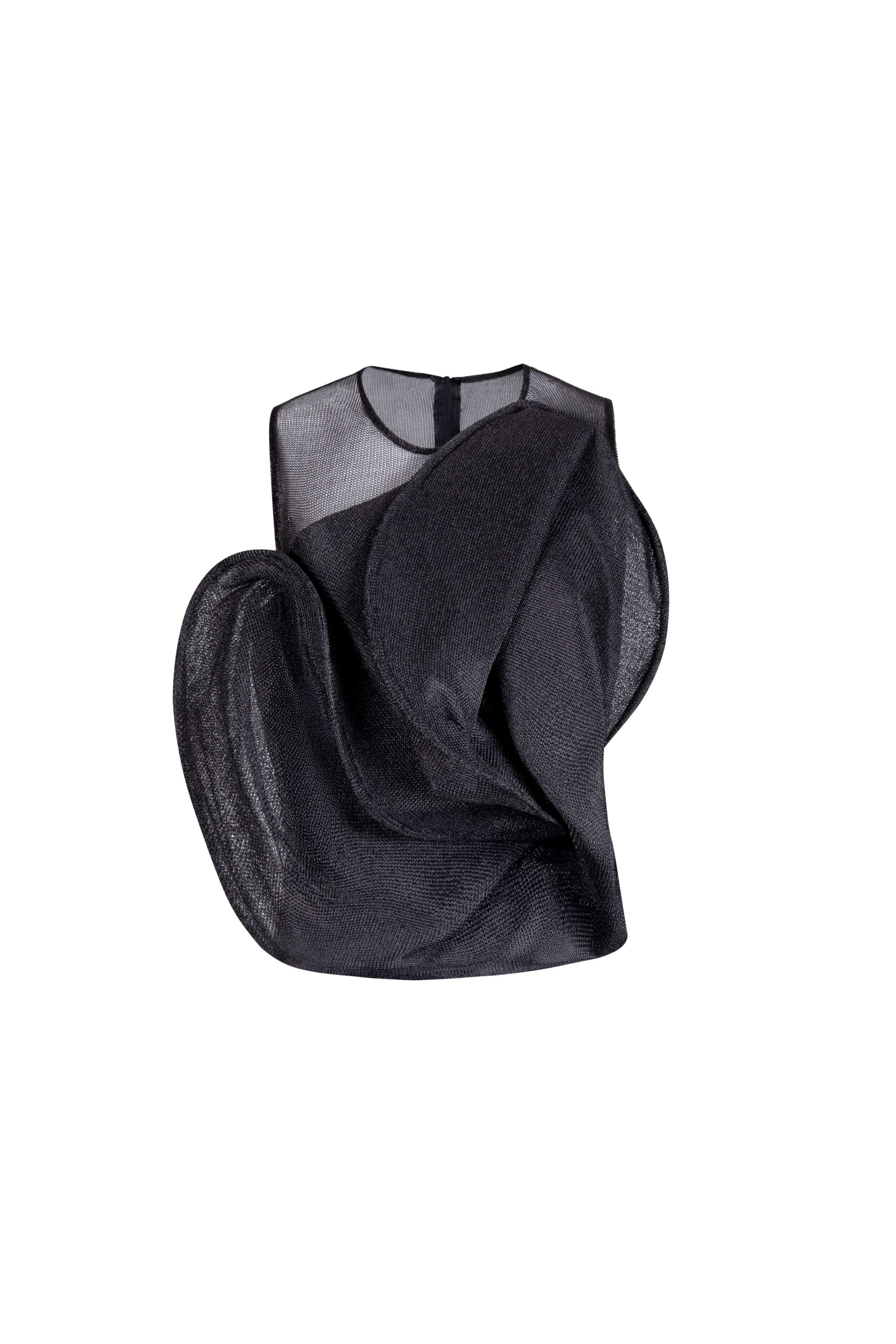 Sheer lurex mesh top featuring sculptural draping and a luminous, body-contouring fit.