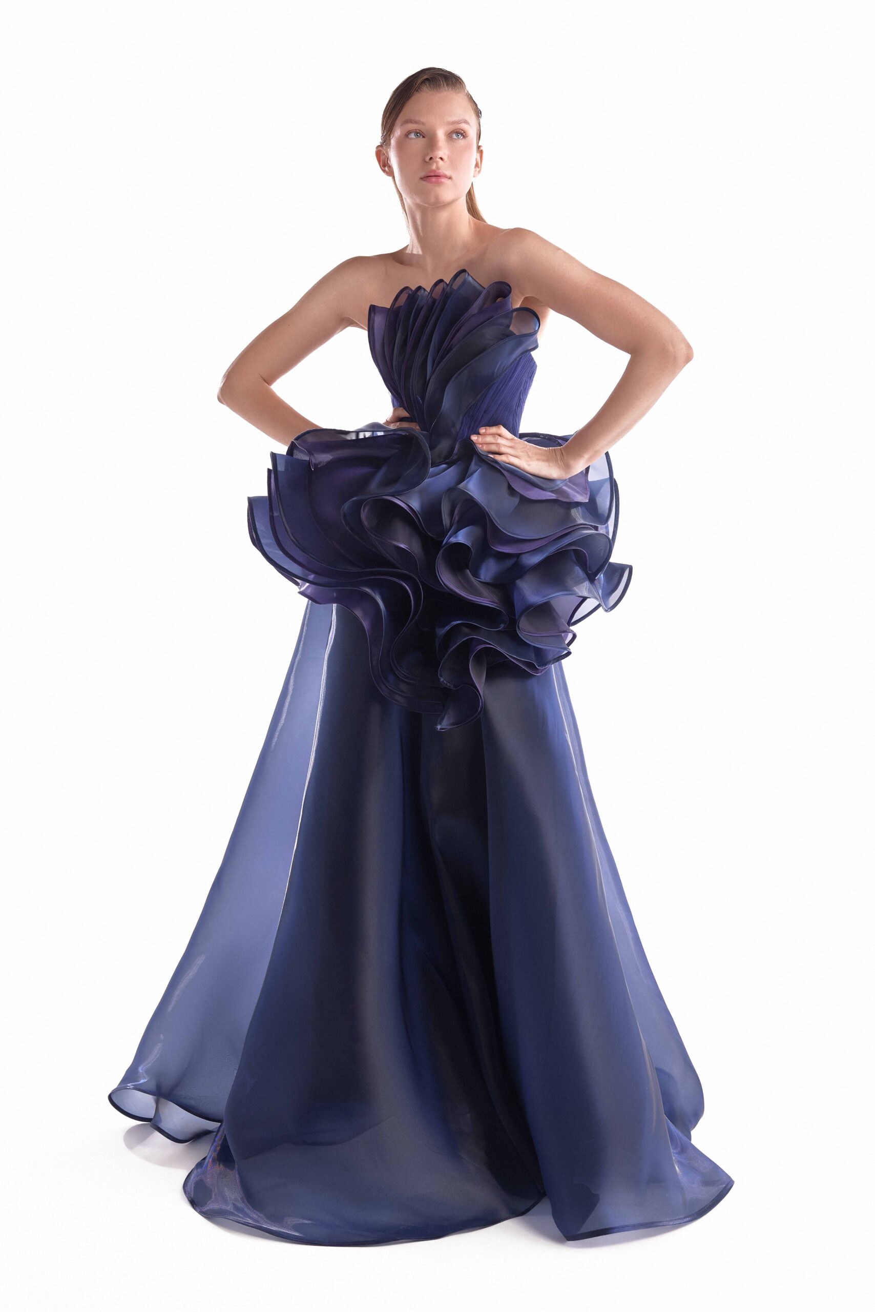 Dazzling in a strapless layered purple and navy fluid organza gown, featuring a dramatic sculptural bloom and a sheer cascading skirt.