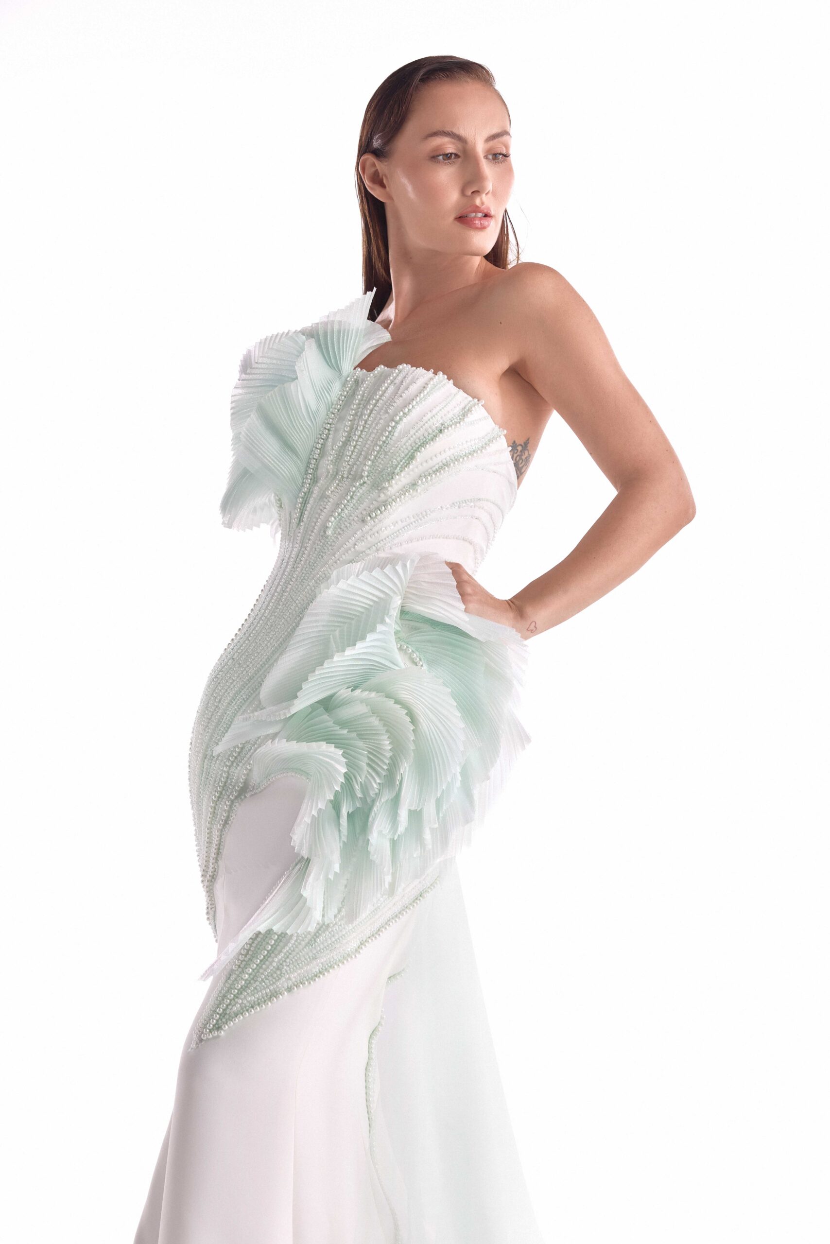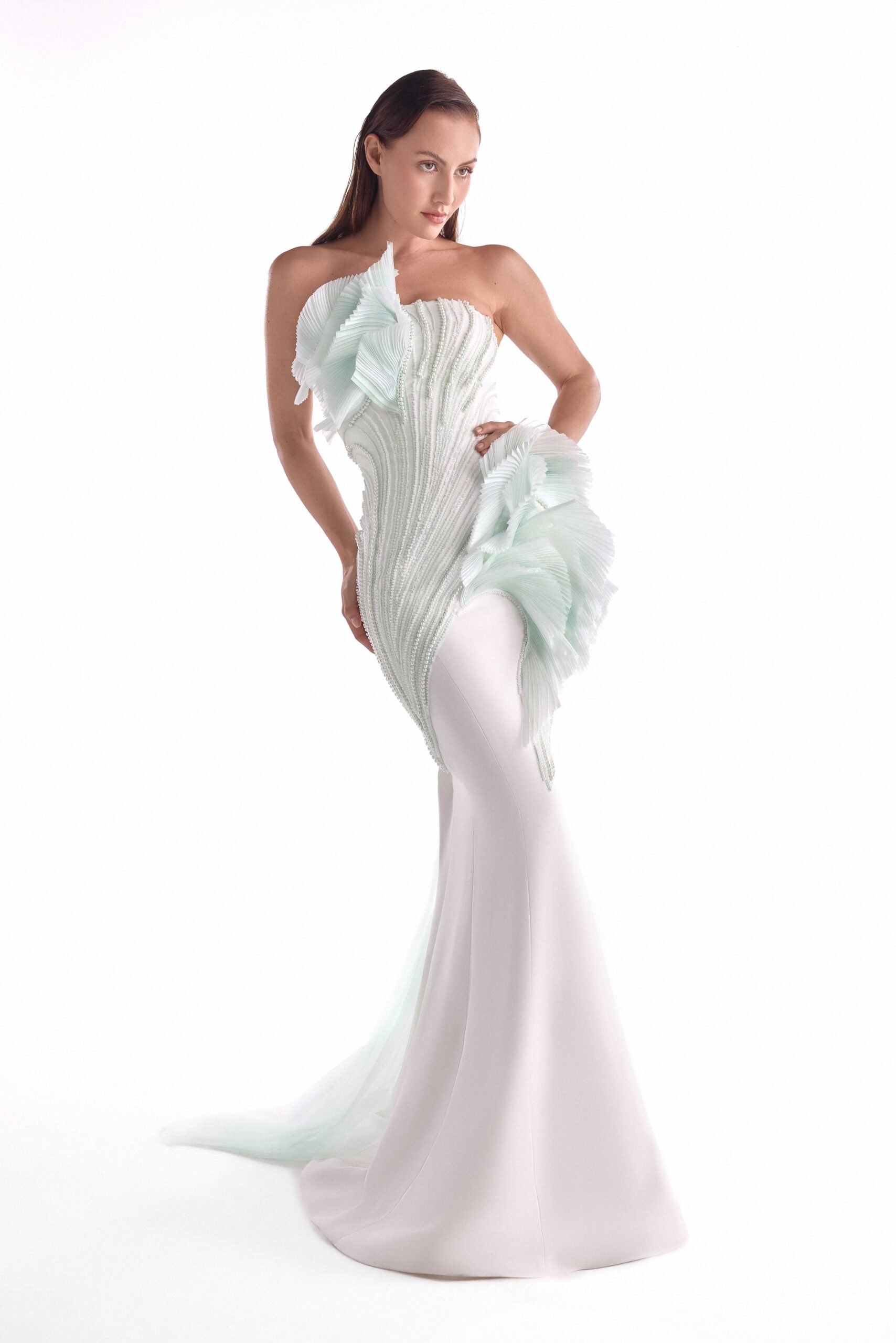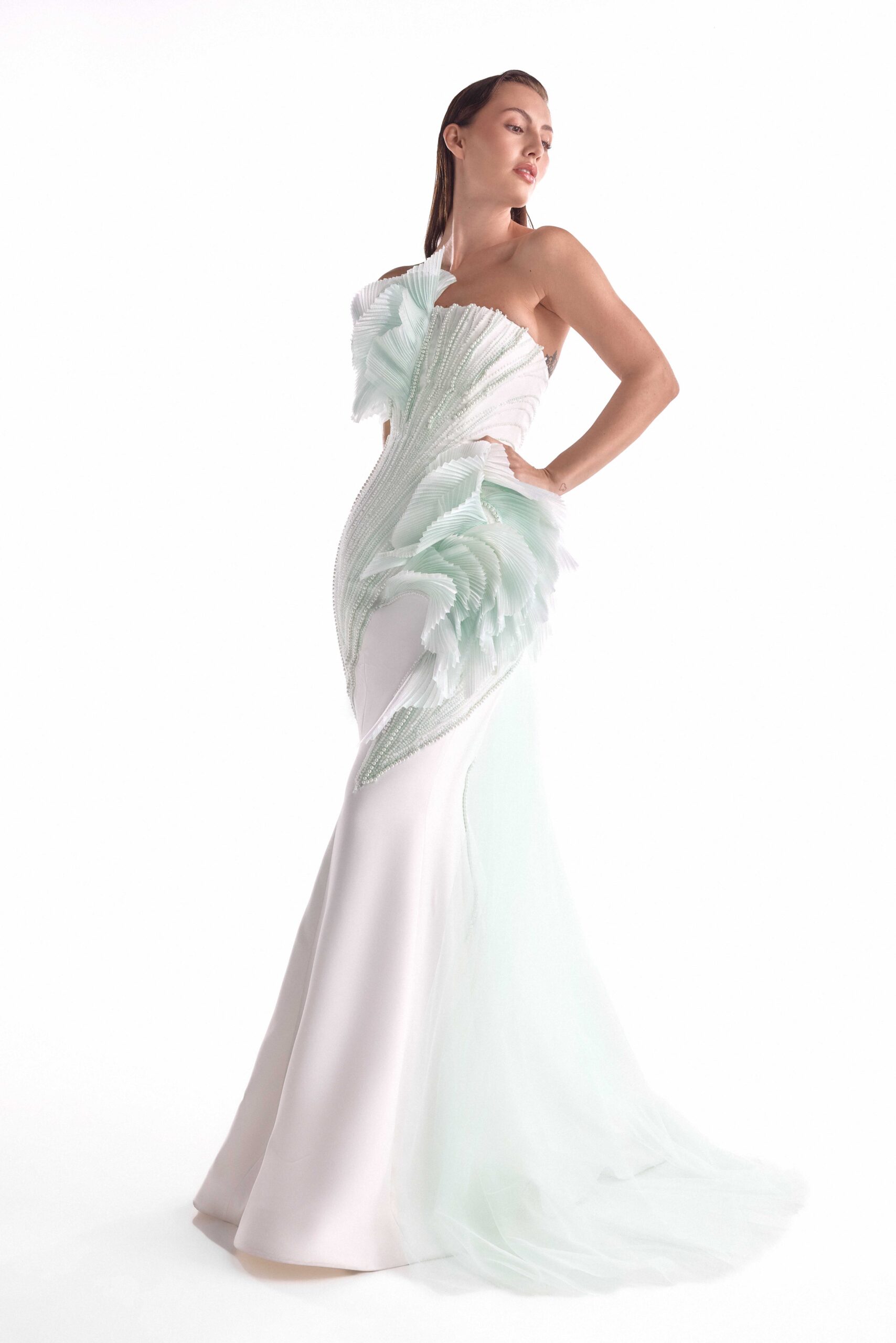 Ethereal elegance meets couture craftsmanship in this off-white mermaid gown, sculpted to celebrate the feminine form. The strapless silhouette is adorned with pleated lam? organza and intricate pearl-embroidered lace in a gradient mint shade, artfully arranged to contour the body in soft, organic movement. Delicate pleated accents create a sense of flow across the bodice and hips, while the fitted mermaid skirt elongates the silhouette with graceful precision. A subtle mint tulle train completes the design, leaving a lasting impression of refined sophistication.