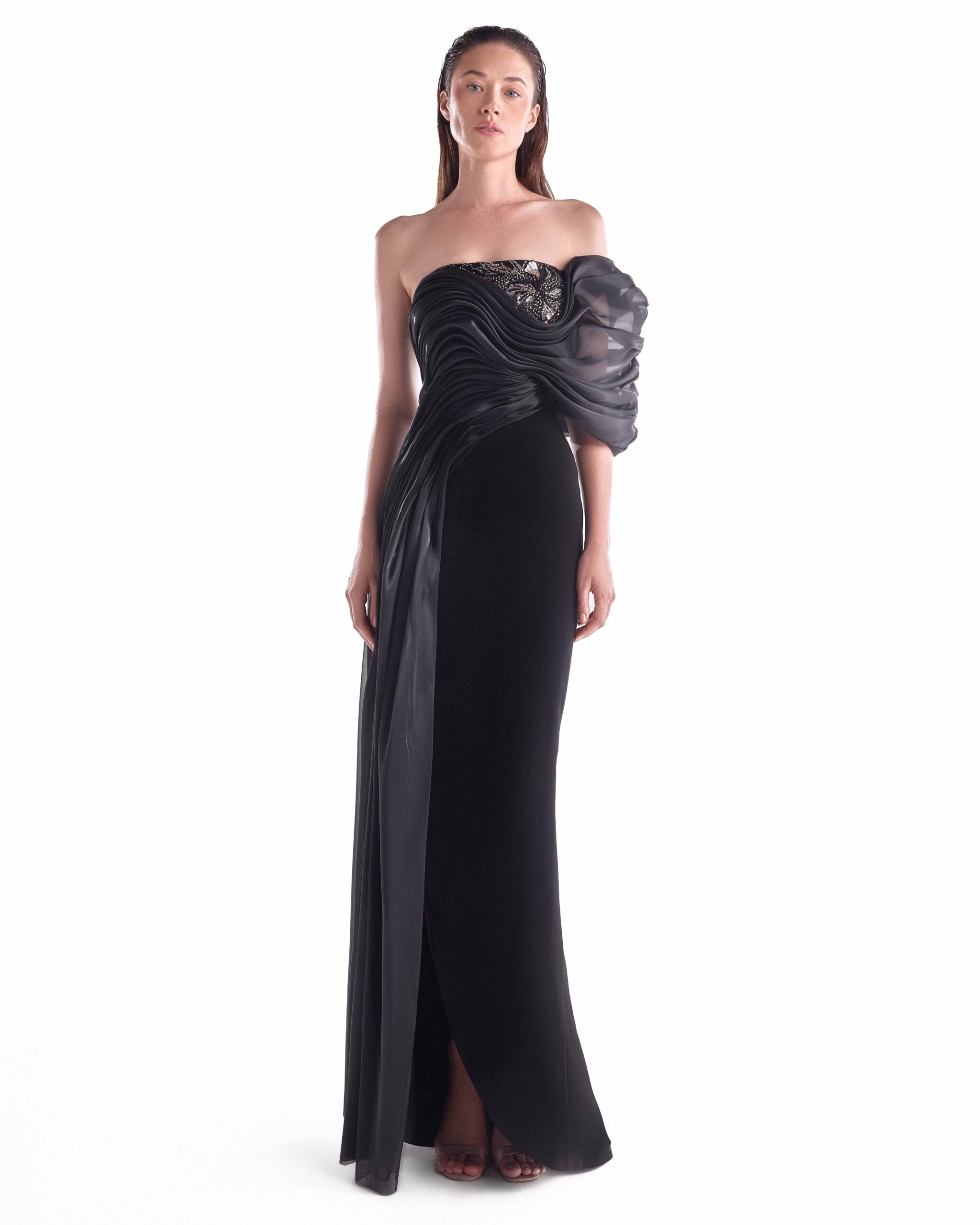Elegant off-shoulder black evening gown featuring fluid organza draping, a lace-embellished bust, and a sleek column silhouette with a high slit.
