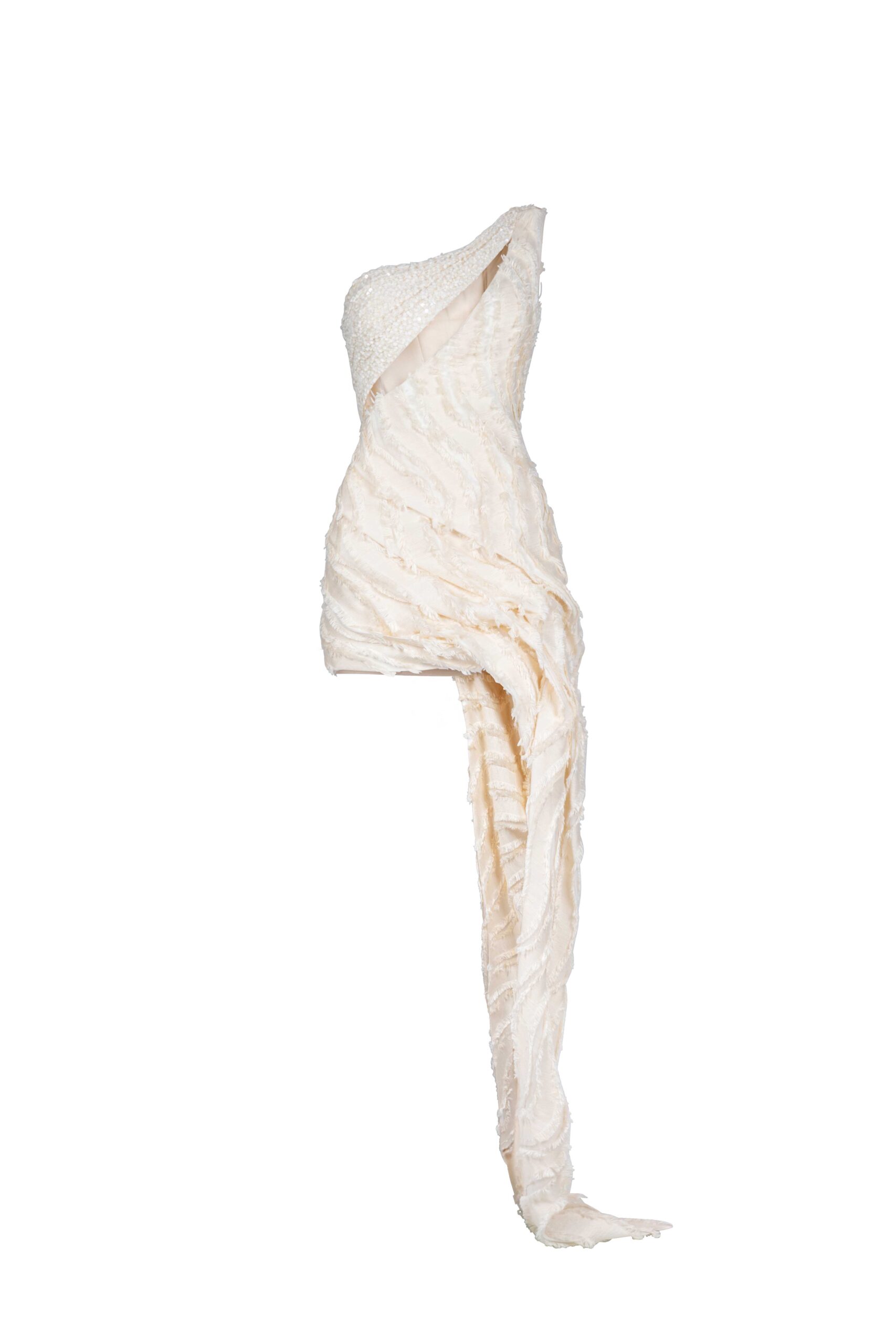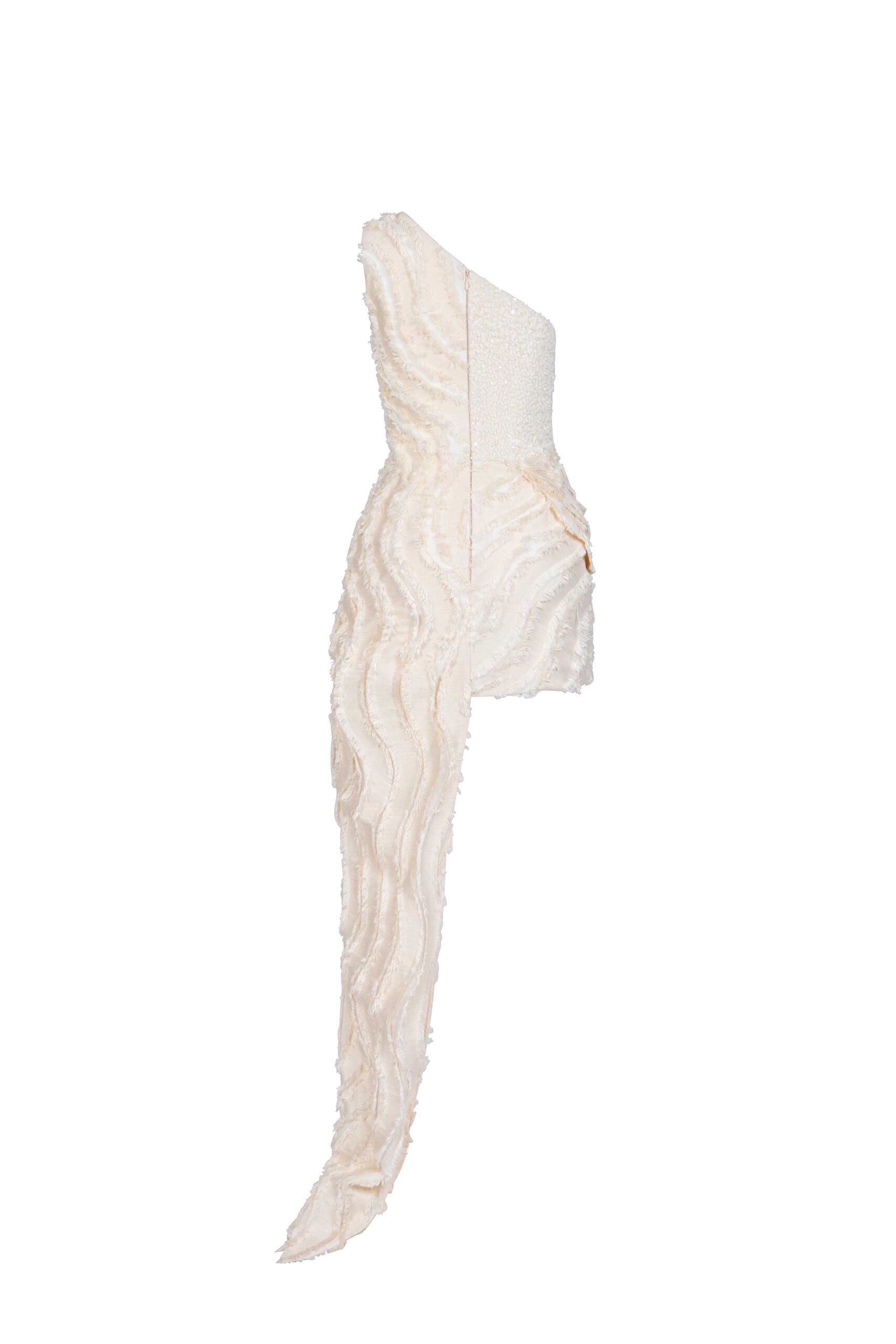 Cream lace and frilled jacquard one-shoulder mini dress with sculpted paneling, a subtle cut-out, and asymmetric cascade.