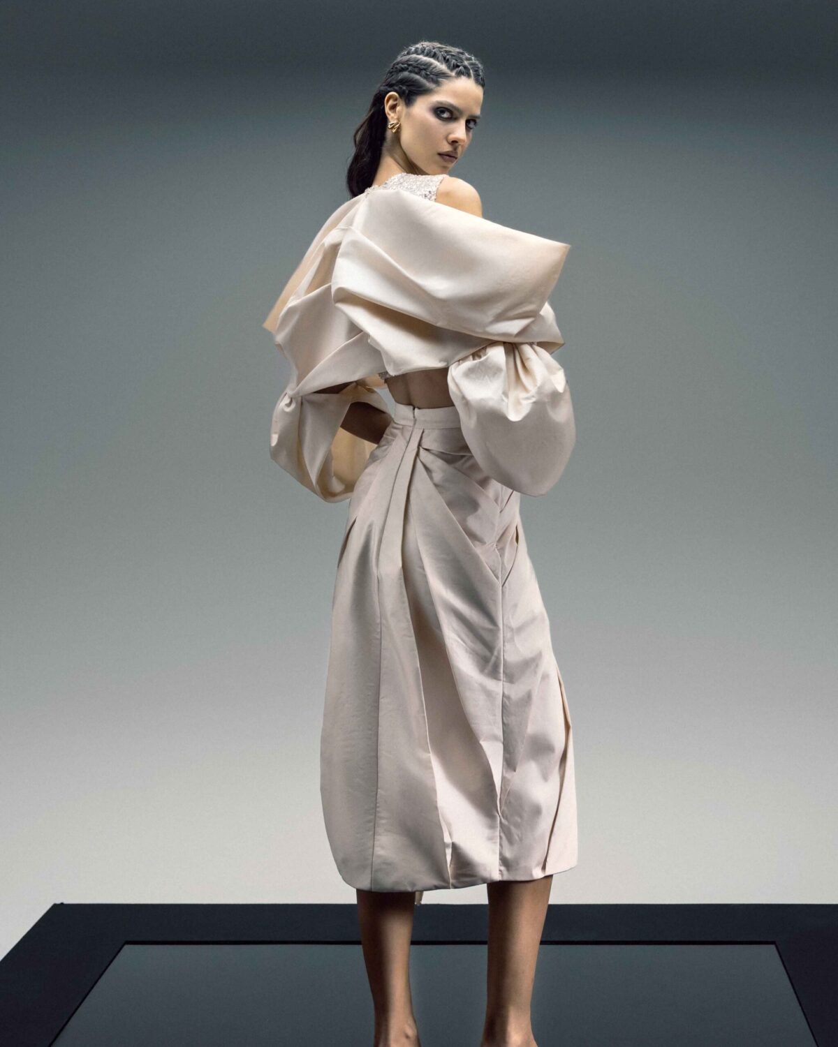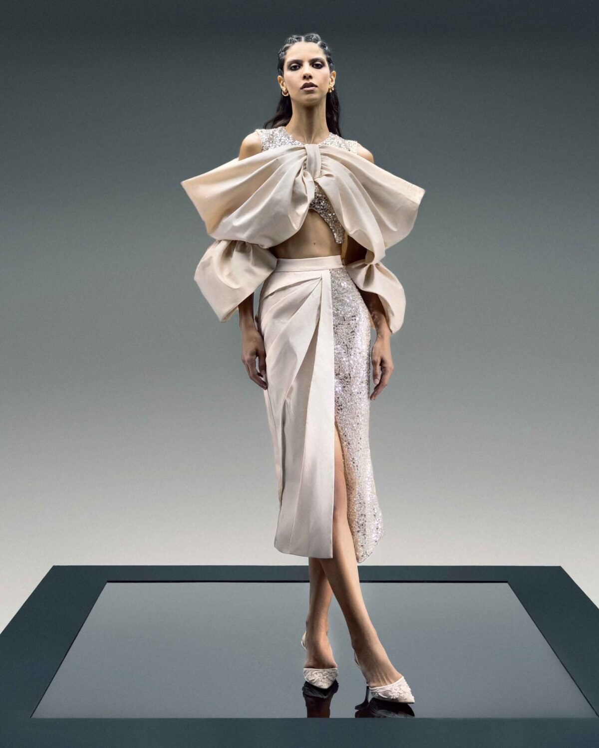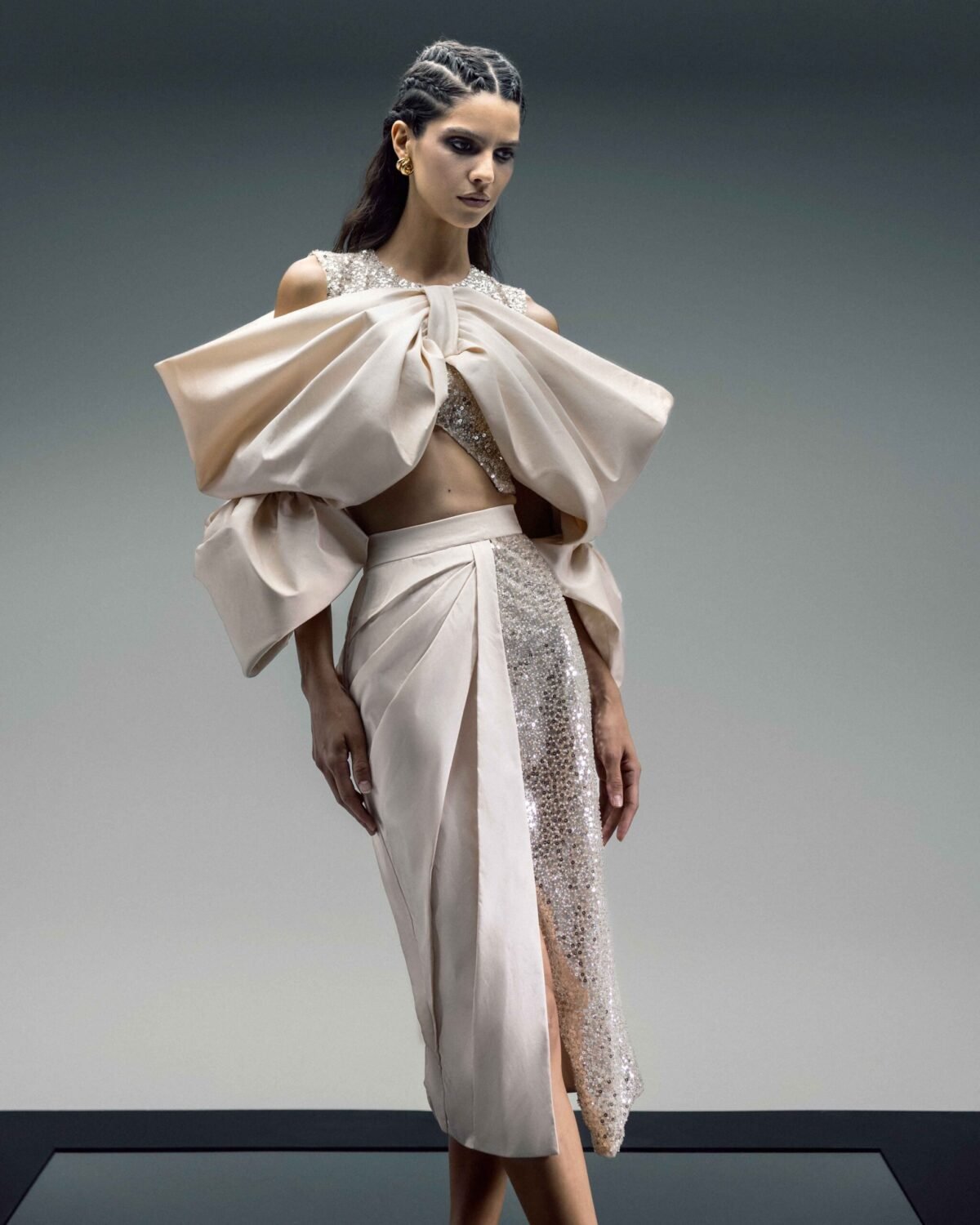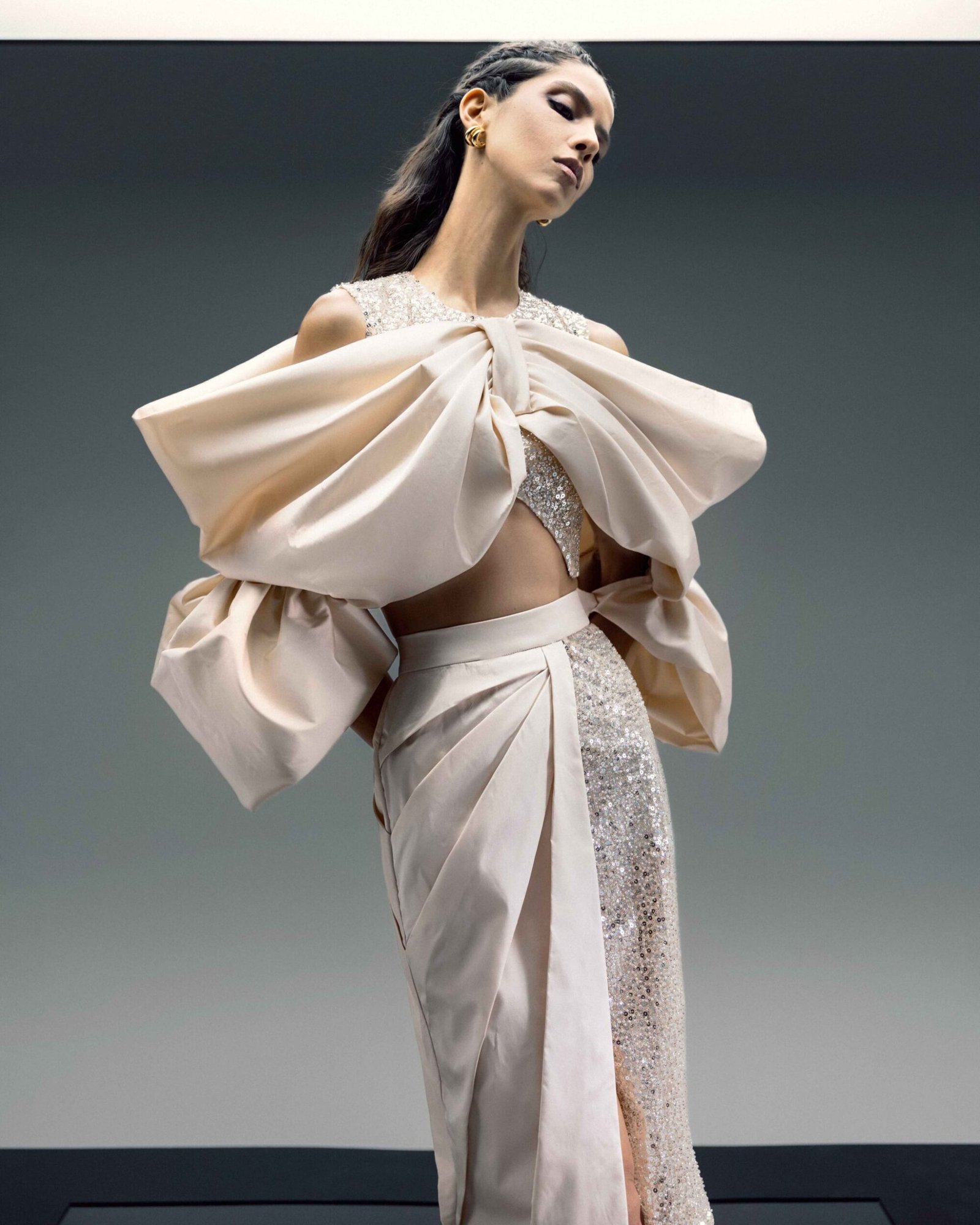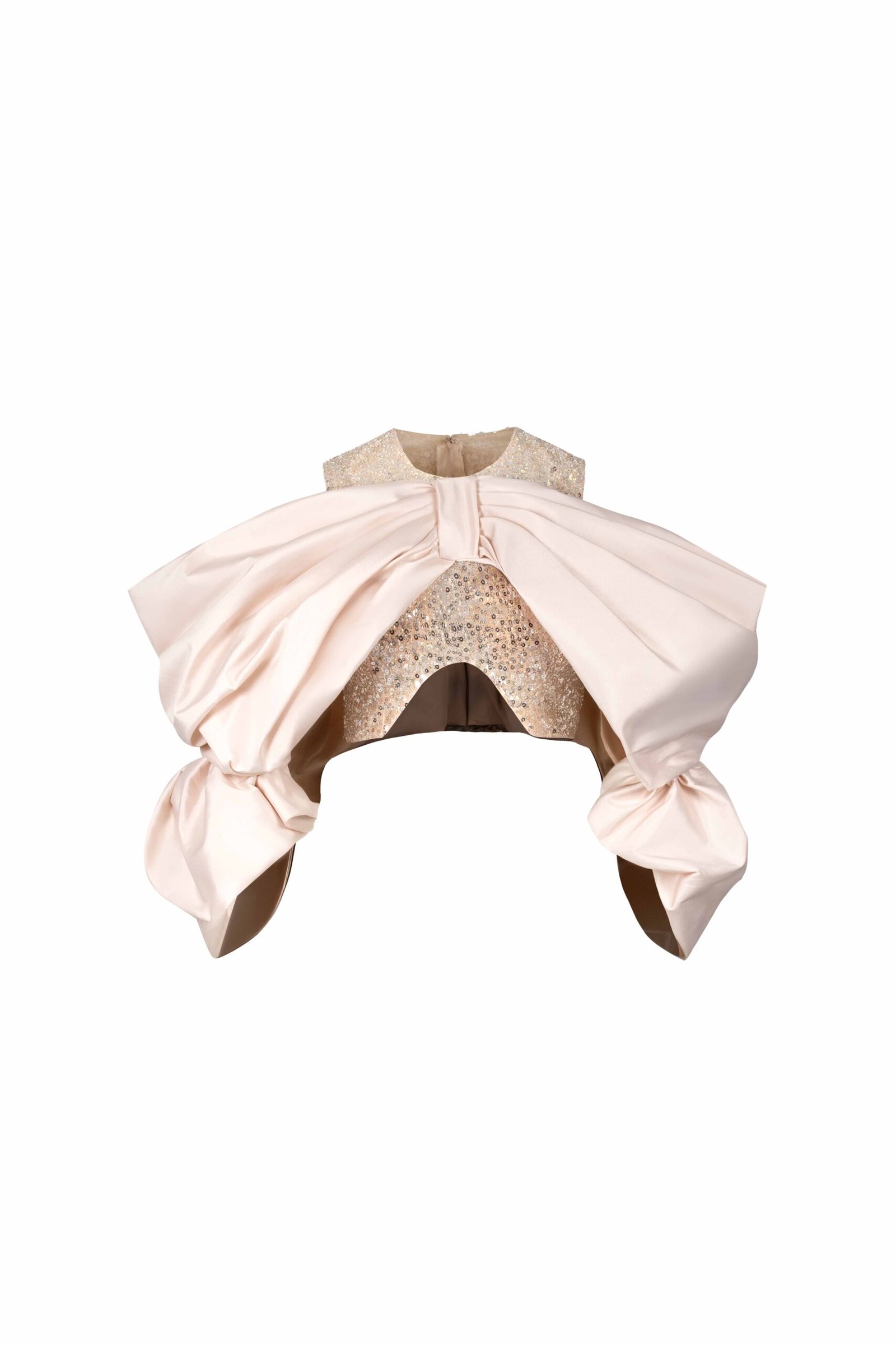 Sequined crop top with voluminous golden taffeta draped sleeves and a sculptural bow front for a modern silhouette.