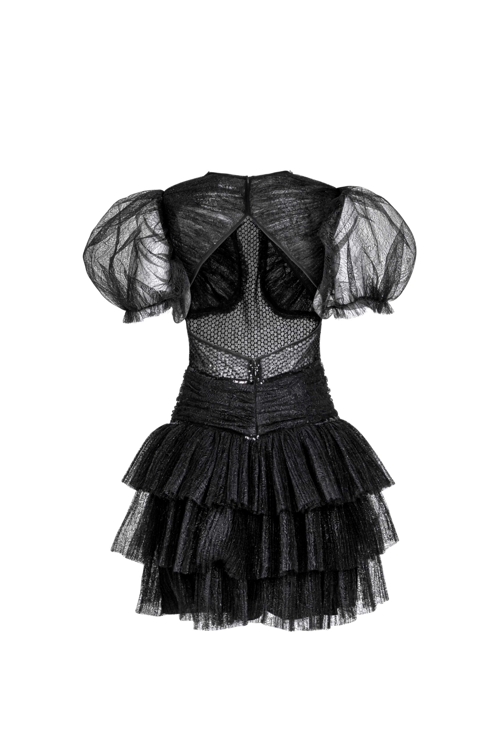 Black Chantilly lace mini dress featuring puffed tulle sleeves, a layered skirt, and an elegant open back.