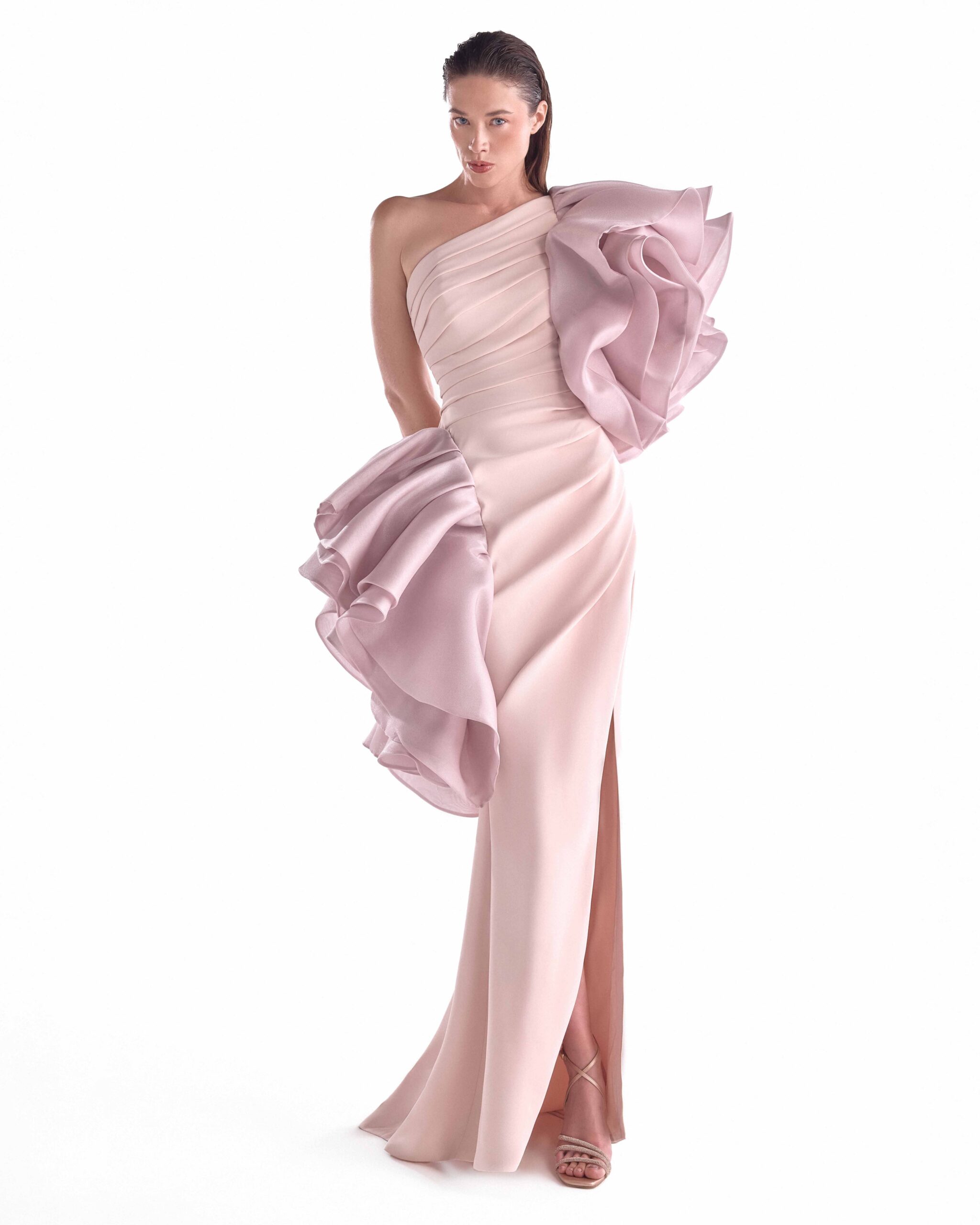 A salmon pink crepe gown accented with bold organza volume at the shoulder and hip, creating a sculptural, contemporary silhouette.