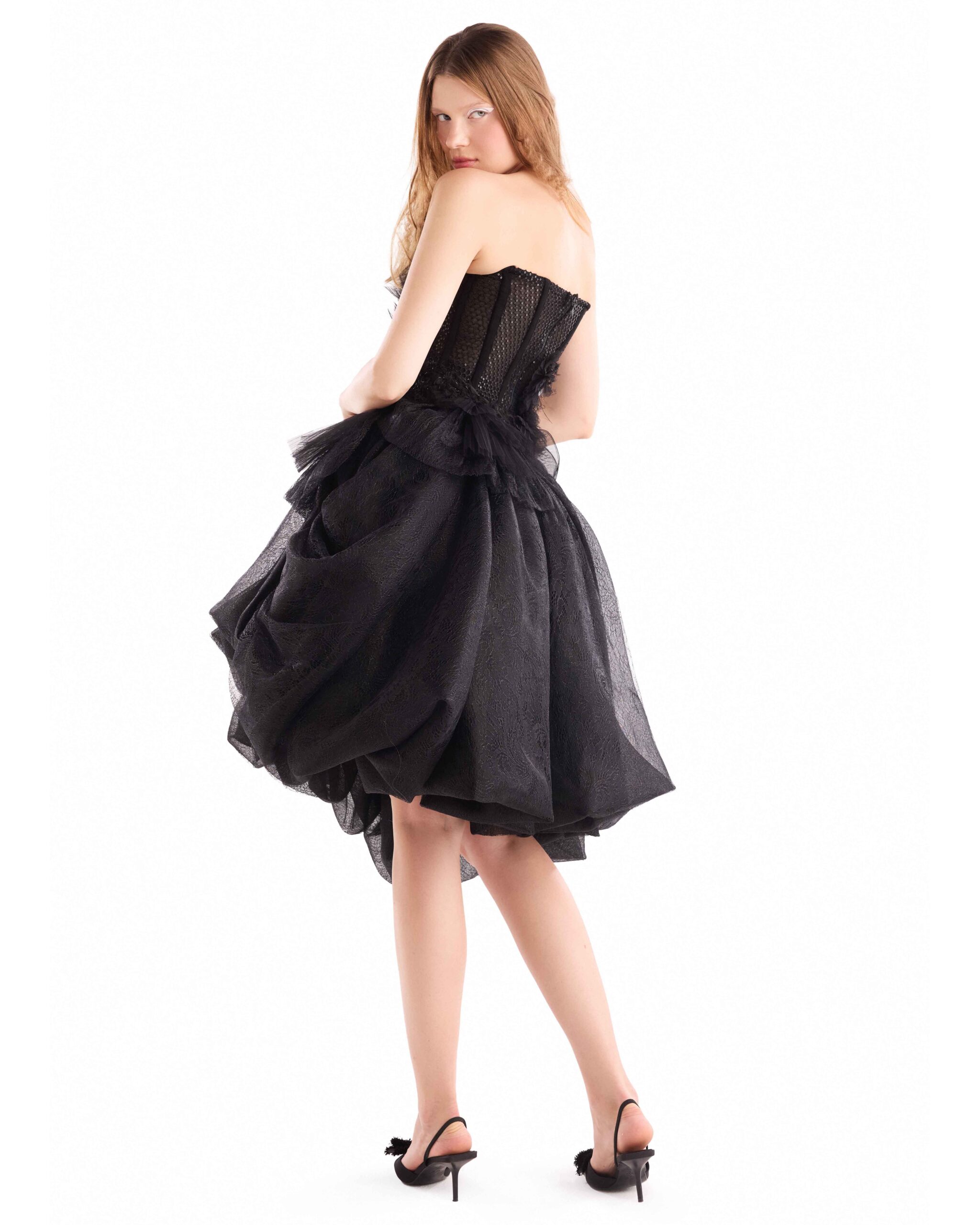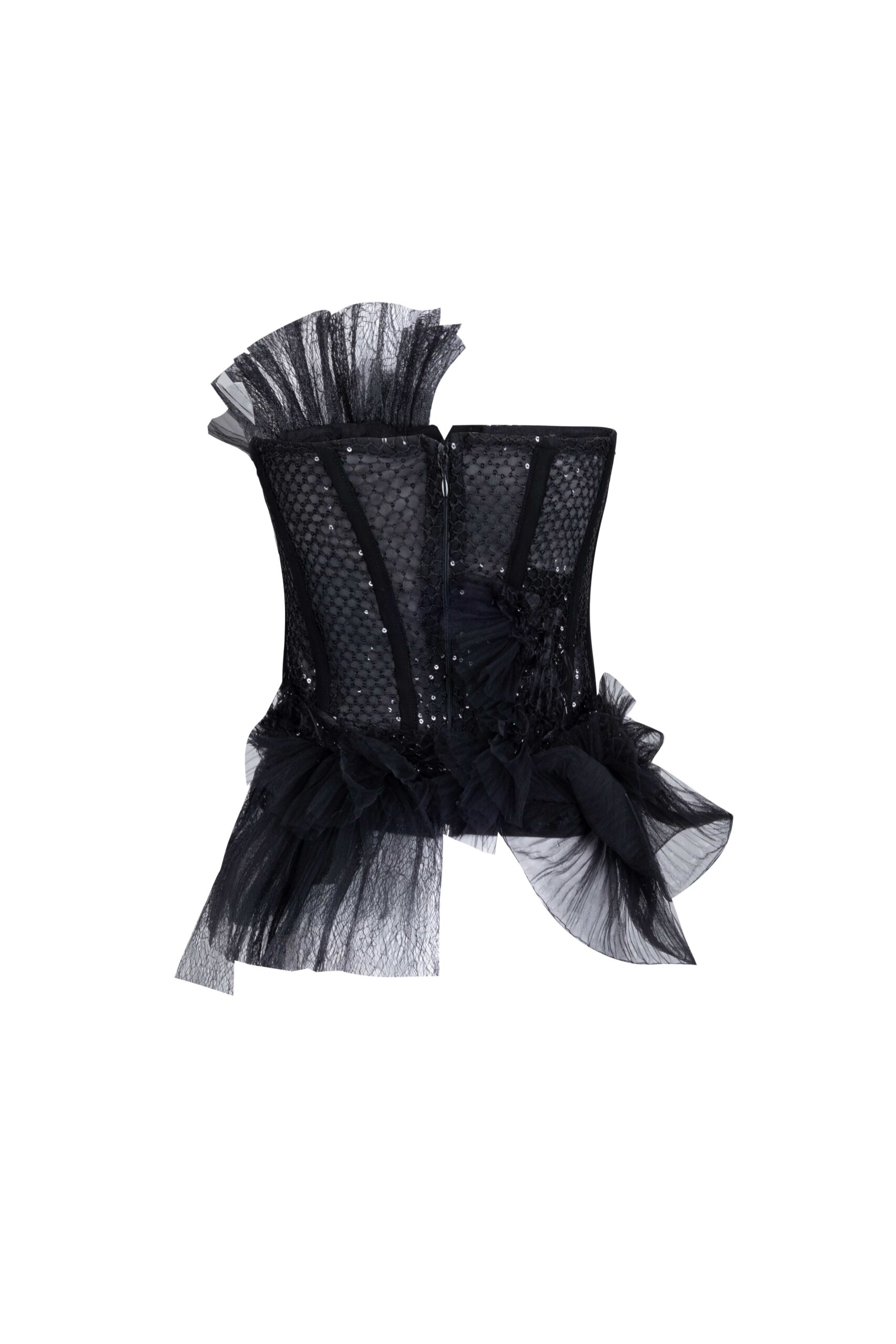 Structured sequined lace corset enhanced with tulle pliss? and Chantilly lace for a sculptural, elevated finish.