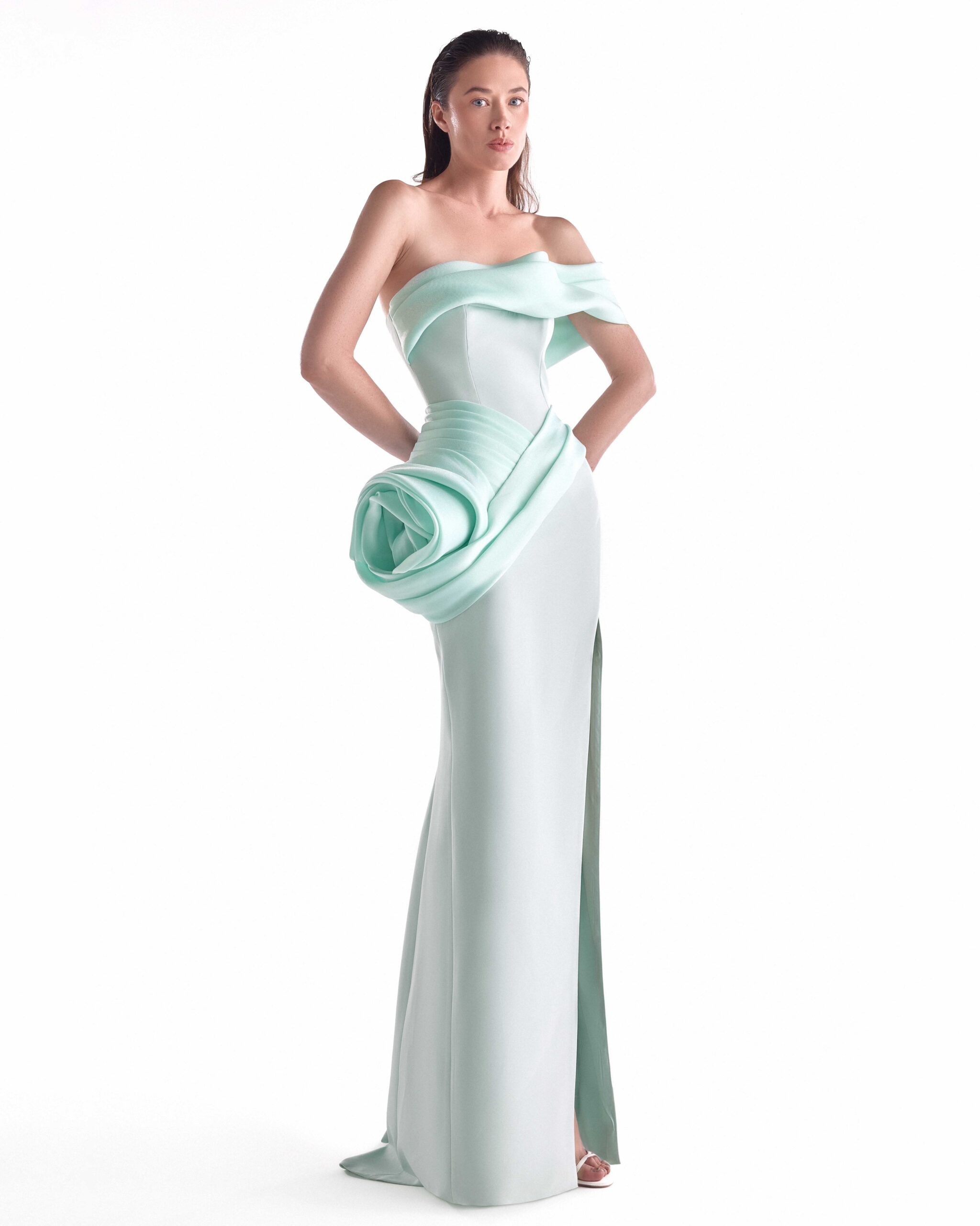 Timeless mint off shoulder gown with fluid organza draping, a statement hip detail and a sleek straight silhouette finished with a high slit.