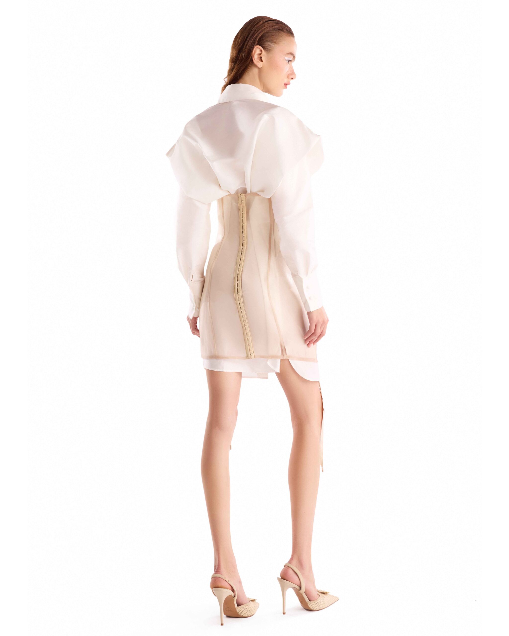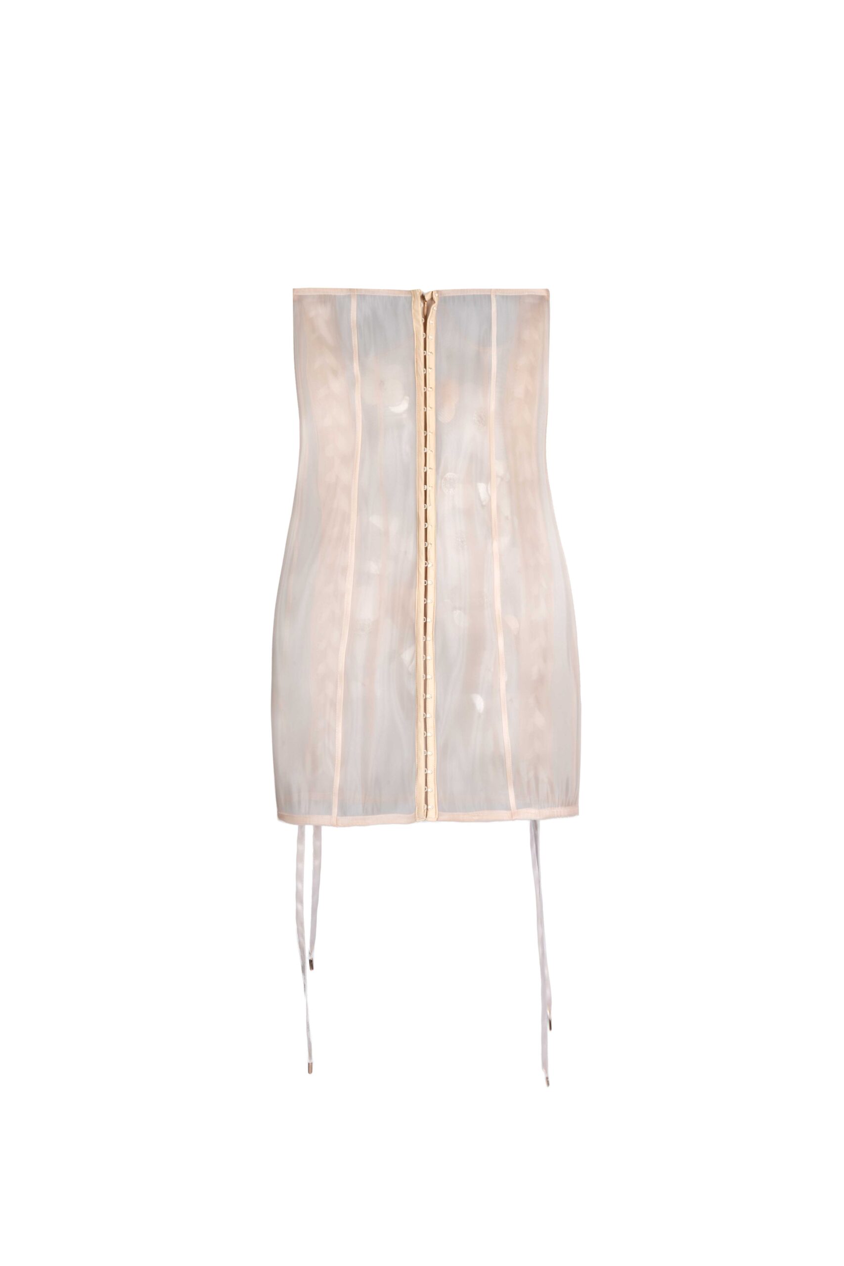 Edgy yet elegant, this sculptural champagne corset features metallic floral appliqu?s, boned structure, and lace-up detailing for a refined, statement finish.