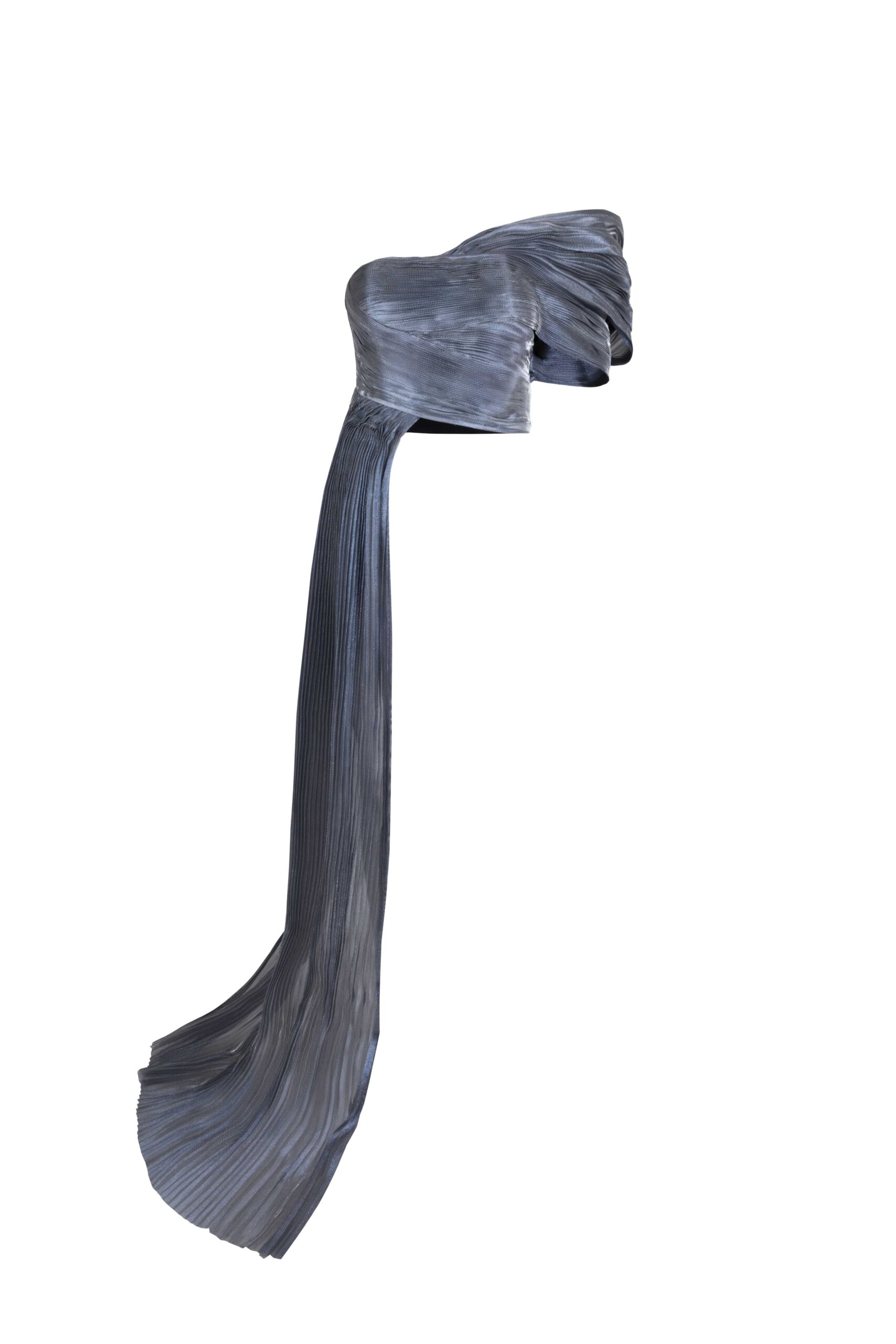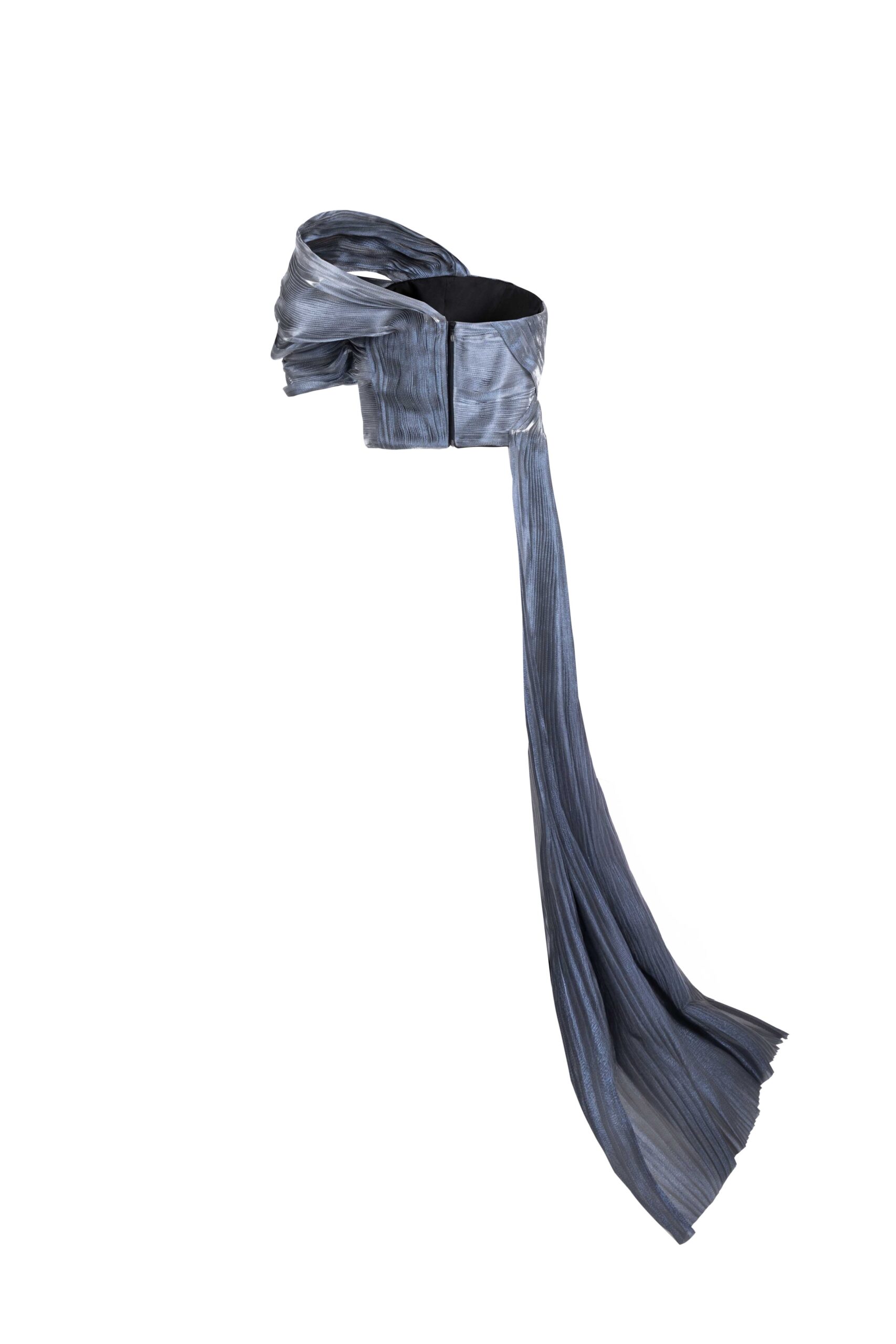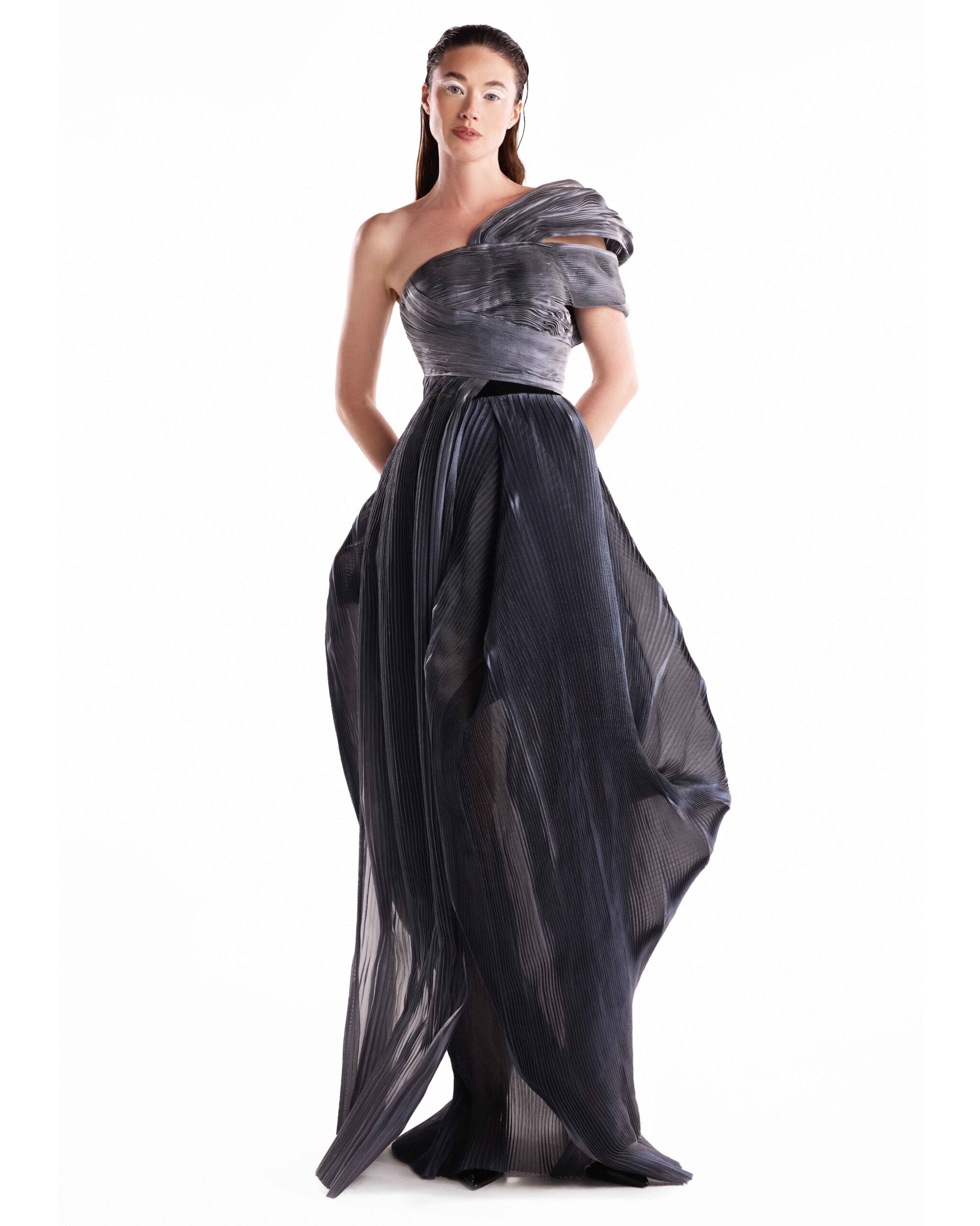 Wrapped in liquid luminosity, this silver lam? organza top is sculpted through soft pleating and asymmetrical draping across the shoulder. Sheer layers ripple around the bodice, creating a fluid, light-catching surface that feels airy, sensual, and delicately architectural.