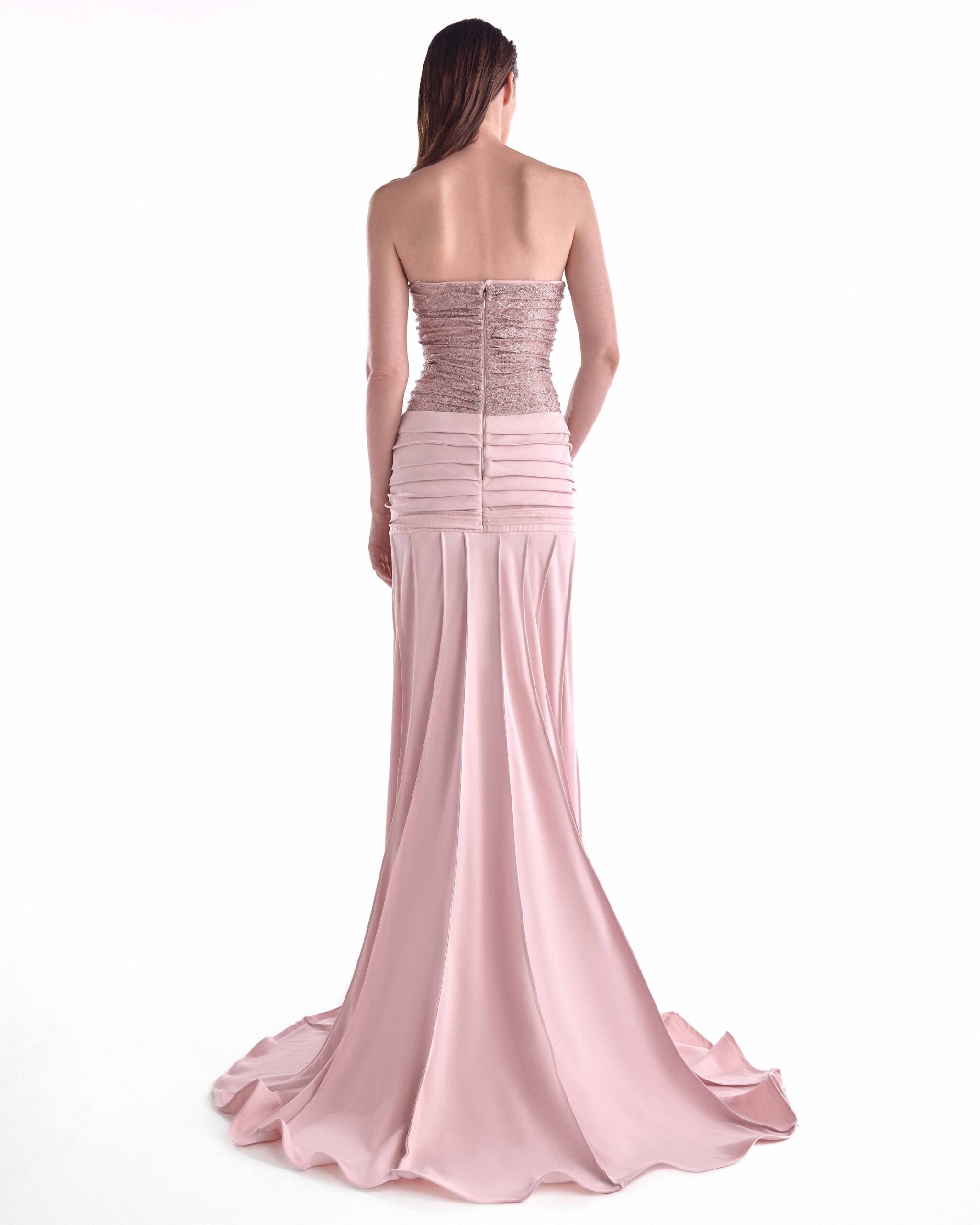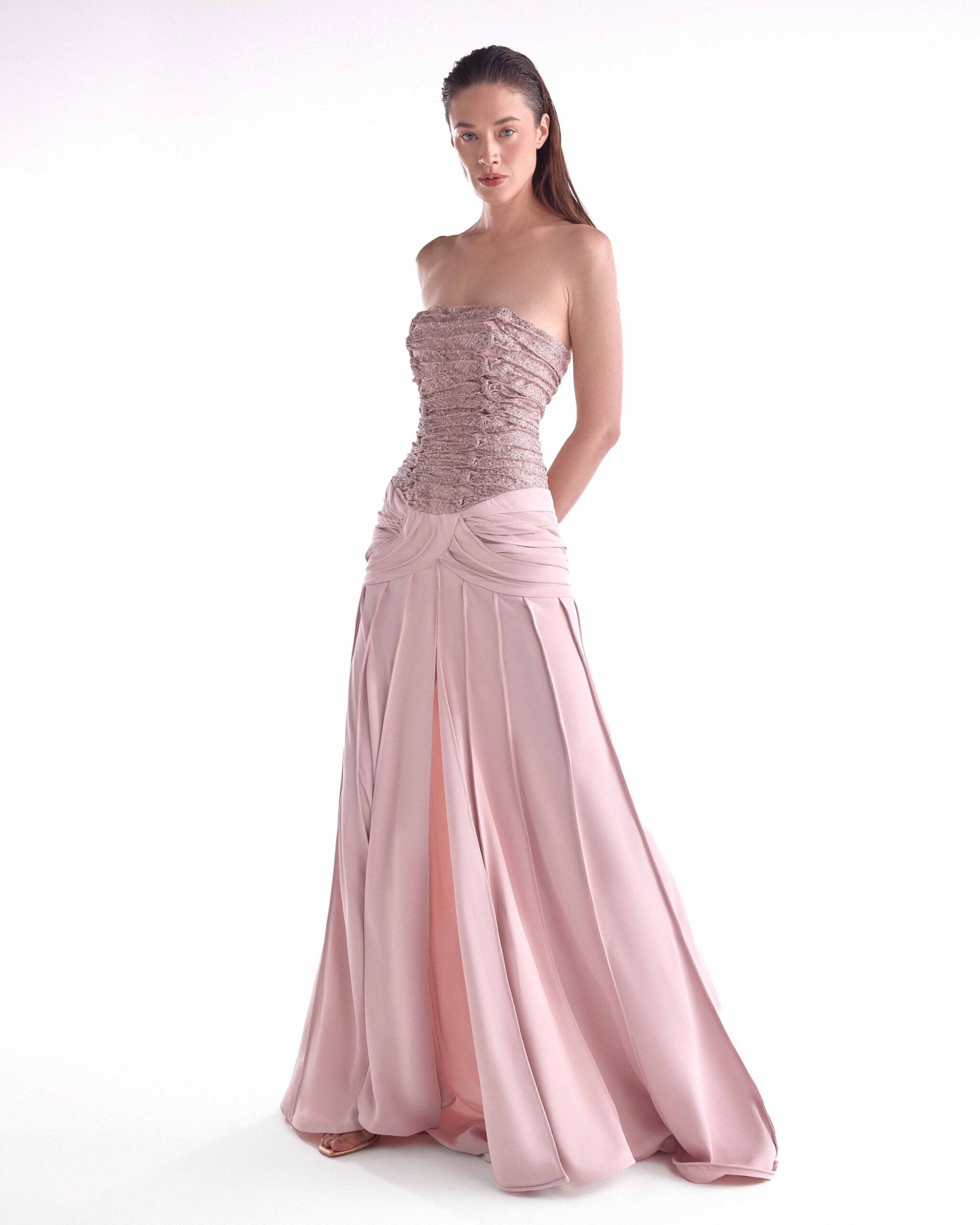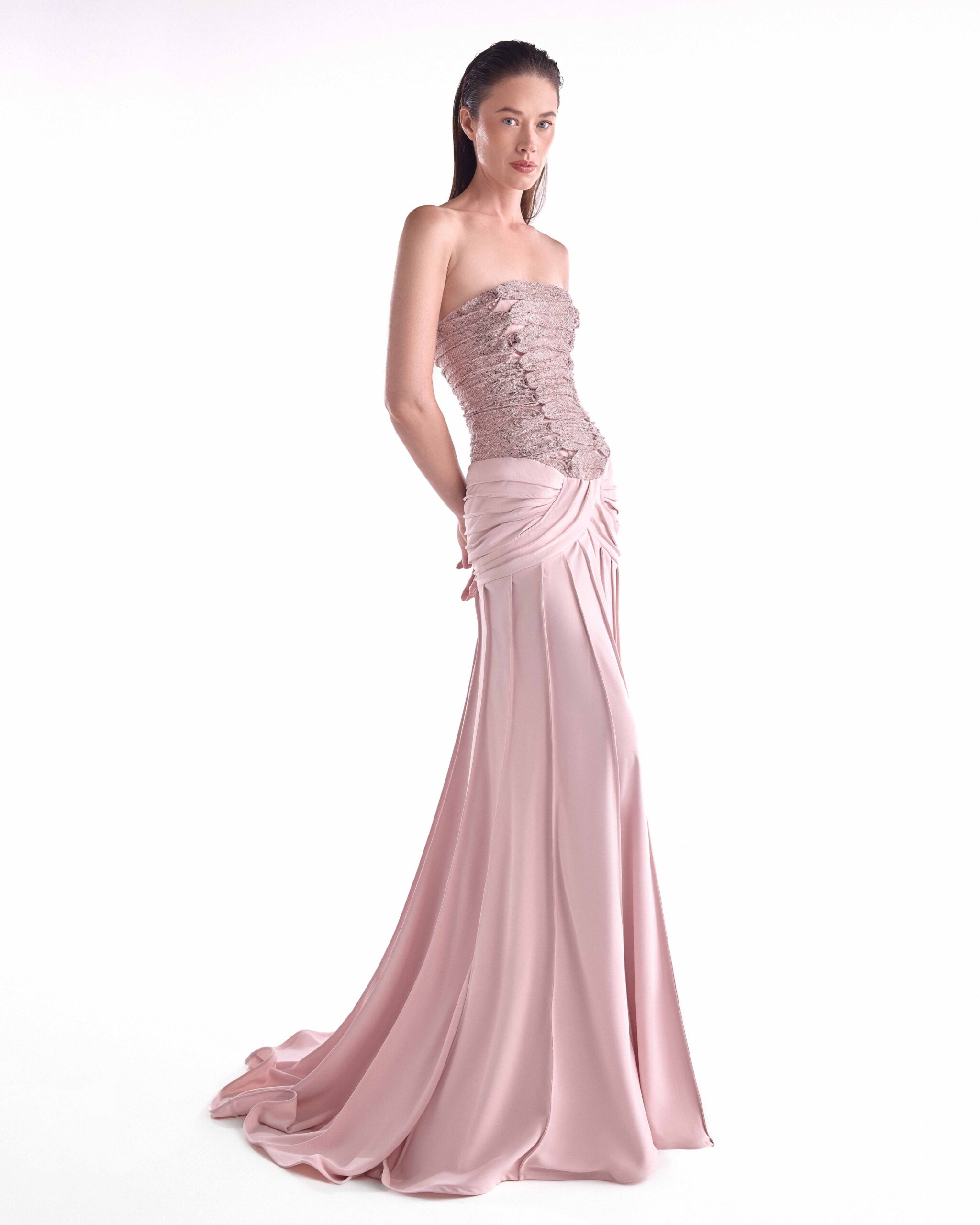 Powder pink evening gown with a gathered sequined lace bust, ribbed crepe draping, and a refined front slit.