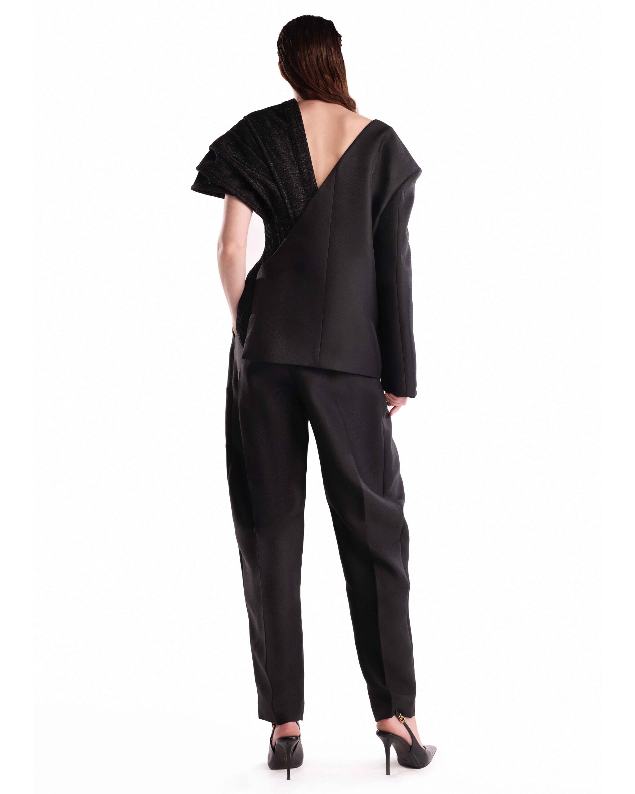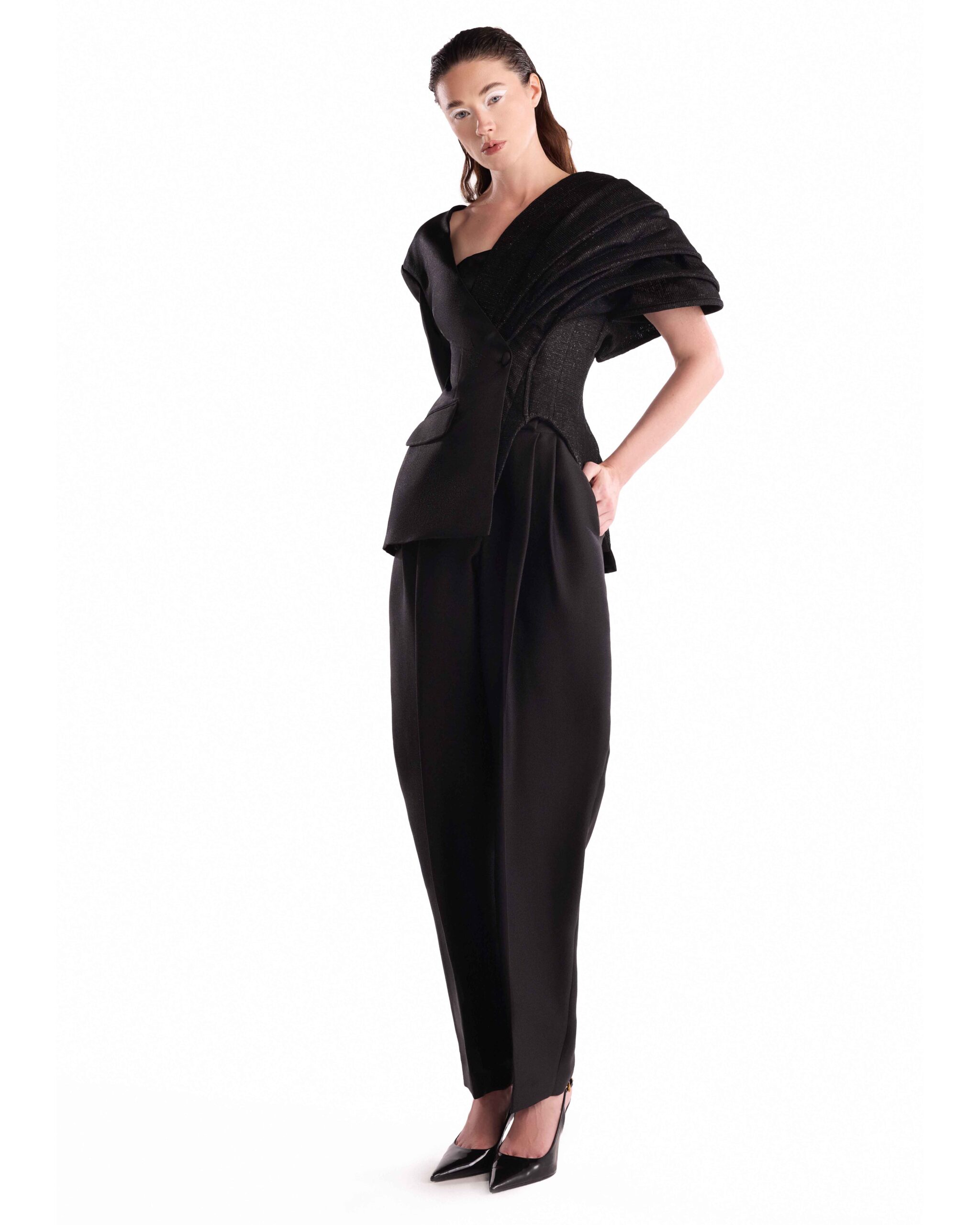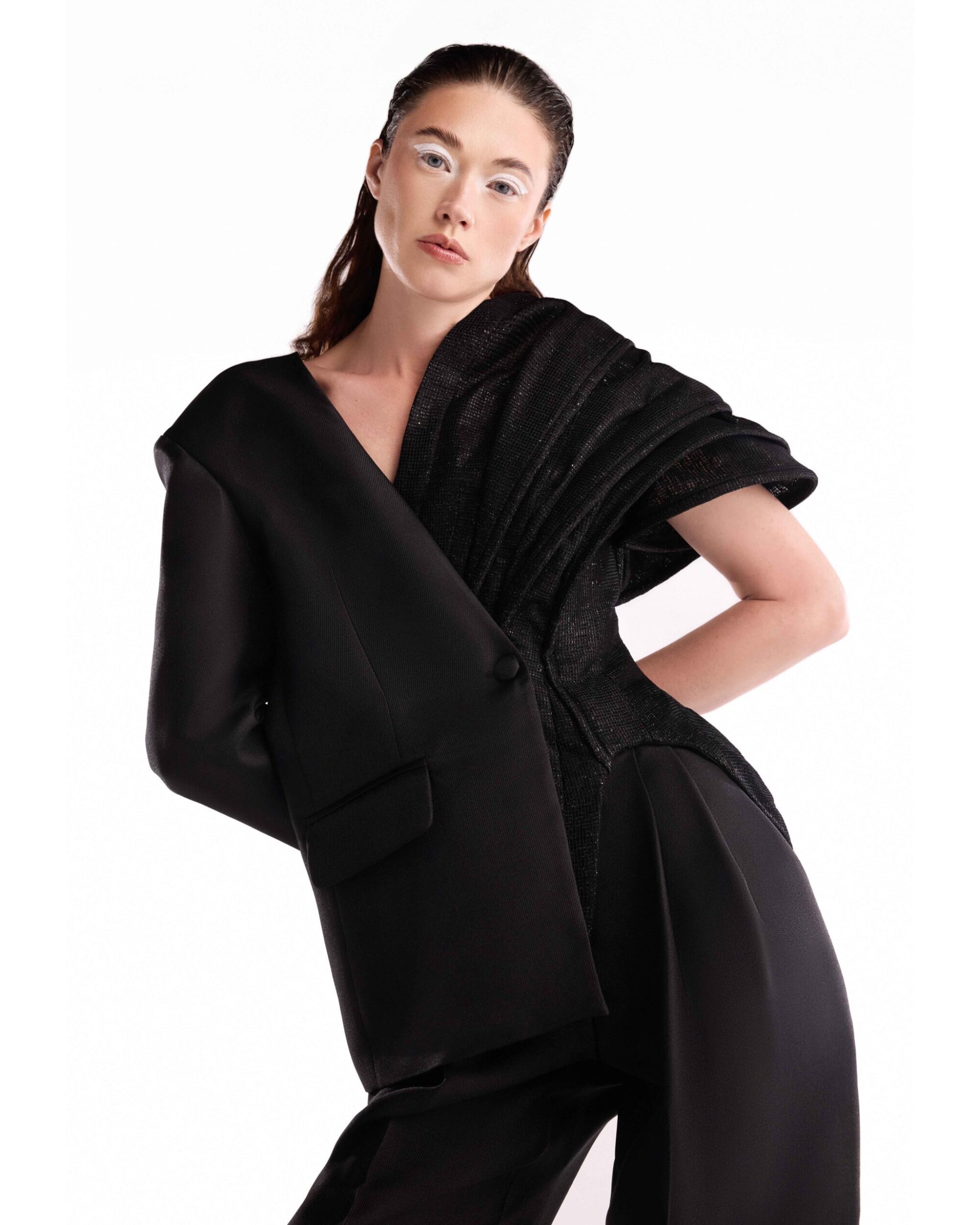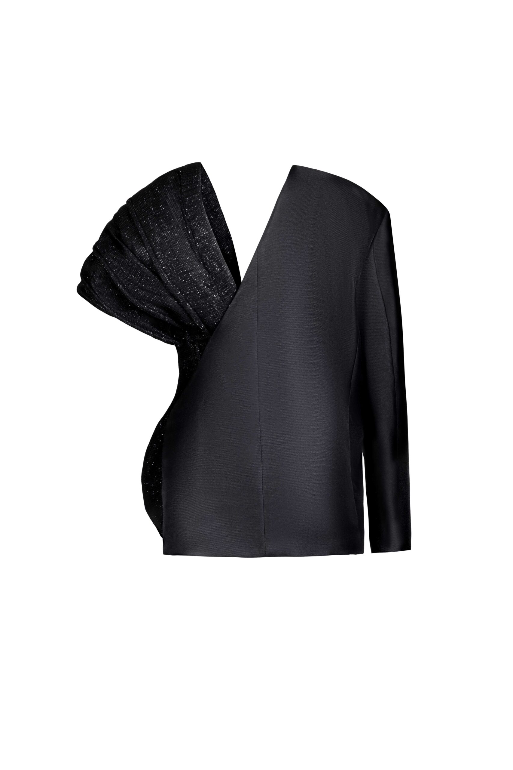 Black piqué jacket featuring subtle shimmer detailing and an asymmetric sculptural silhouette.