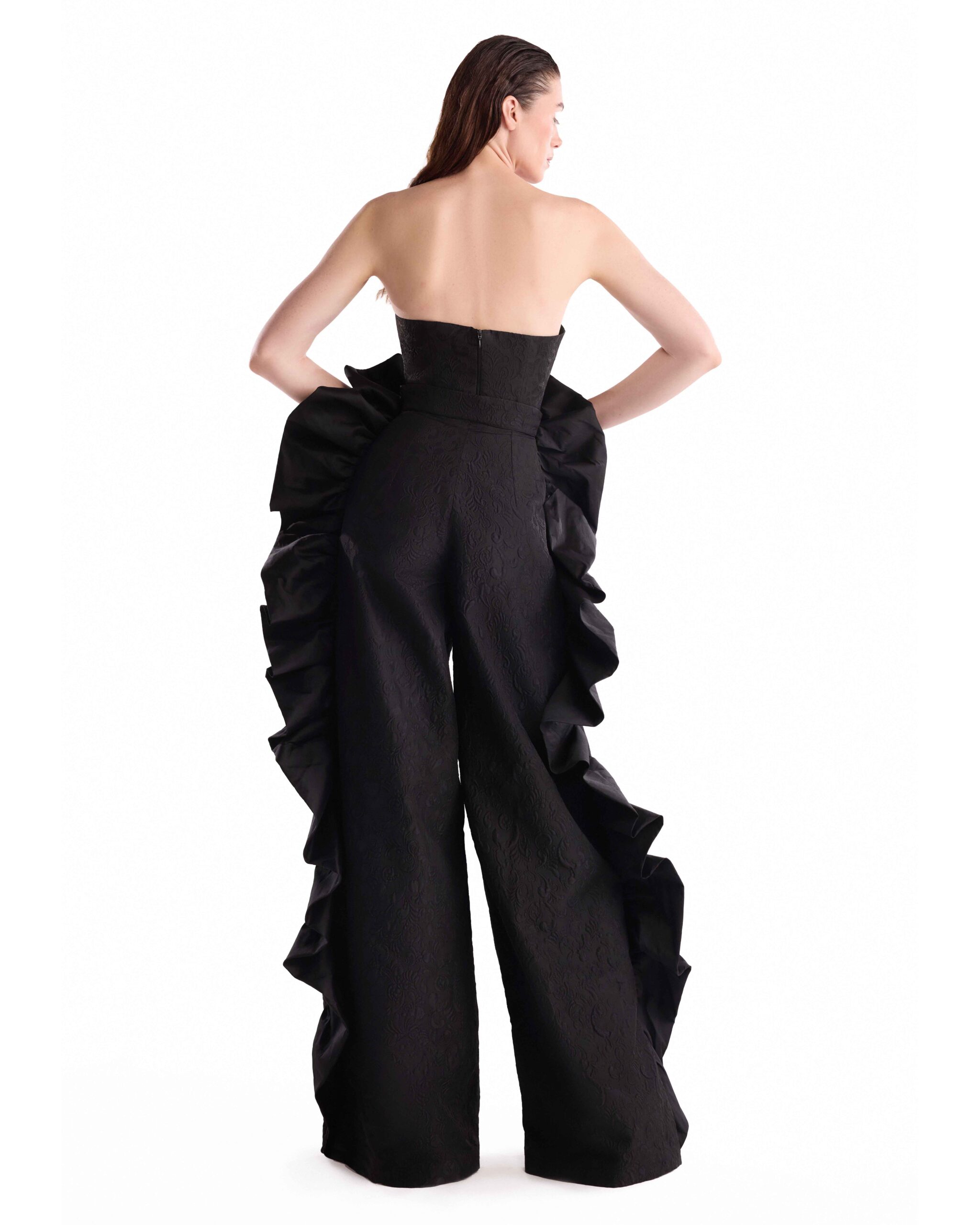 Strapless black taffeta overall with a rounded neckline and cascading ruffles.
