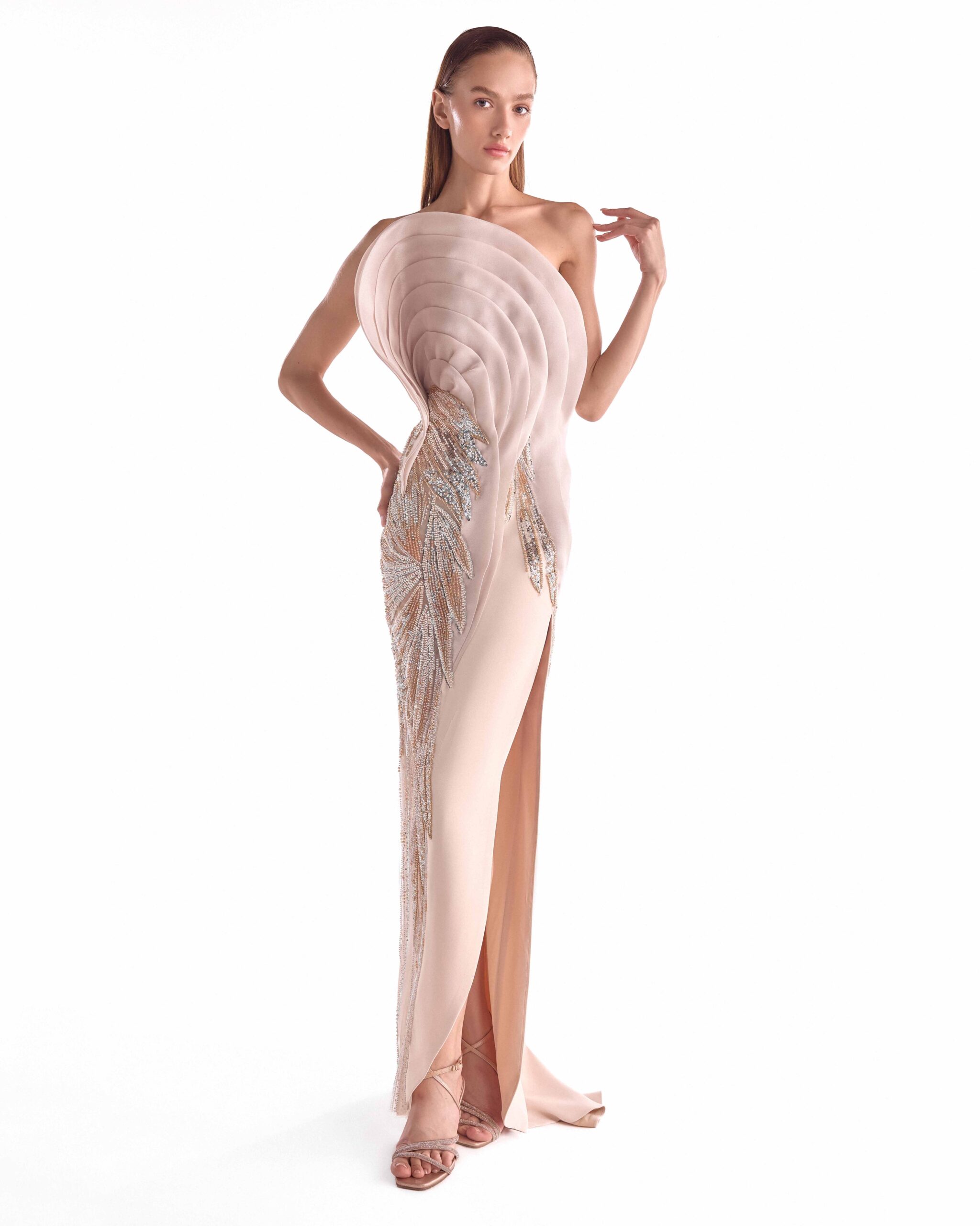 Defined by sculptural detailing, this strapless nude gown features a fan-shaped organza bust, lace embroidery, and a sleek silhouette with a high slit.