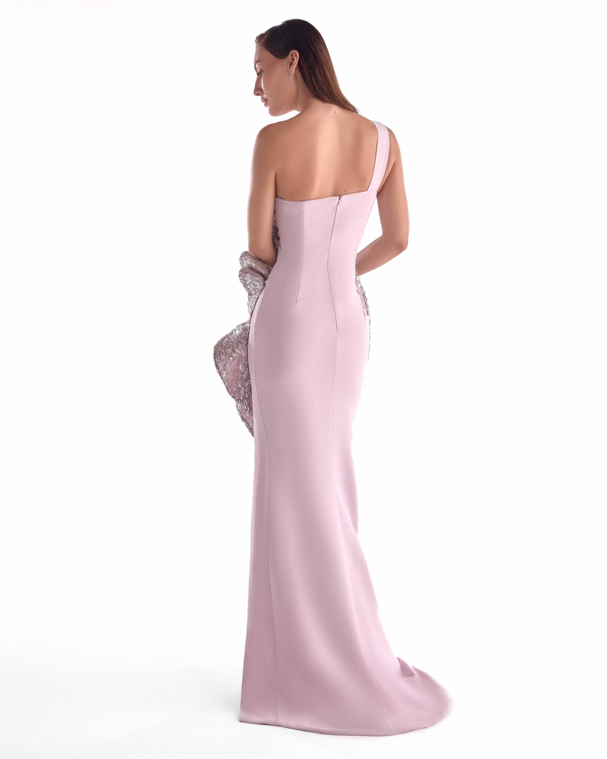 Dusty pink crepe gown featuring a one-shoulder silhouette with sculptural embellished detailing for an elegant couture finish.