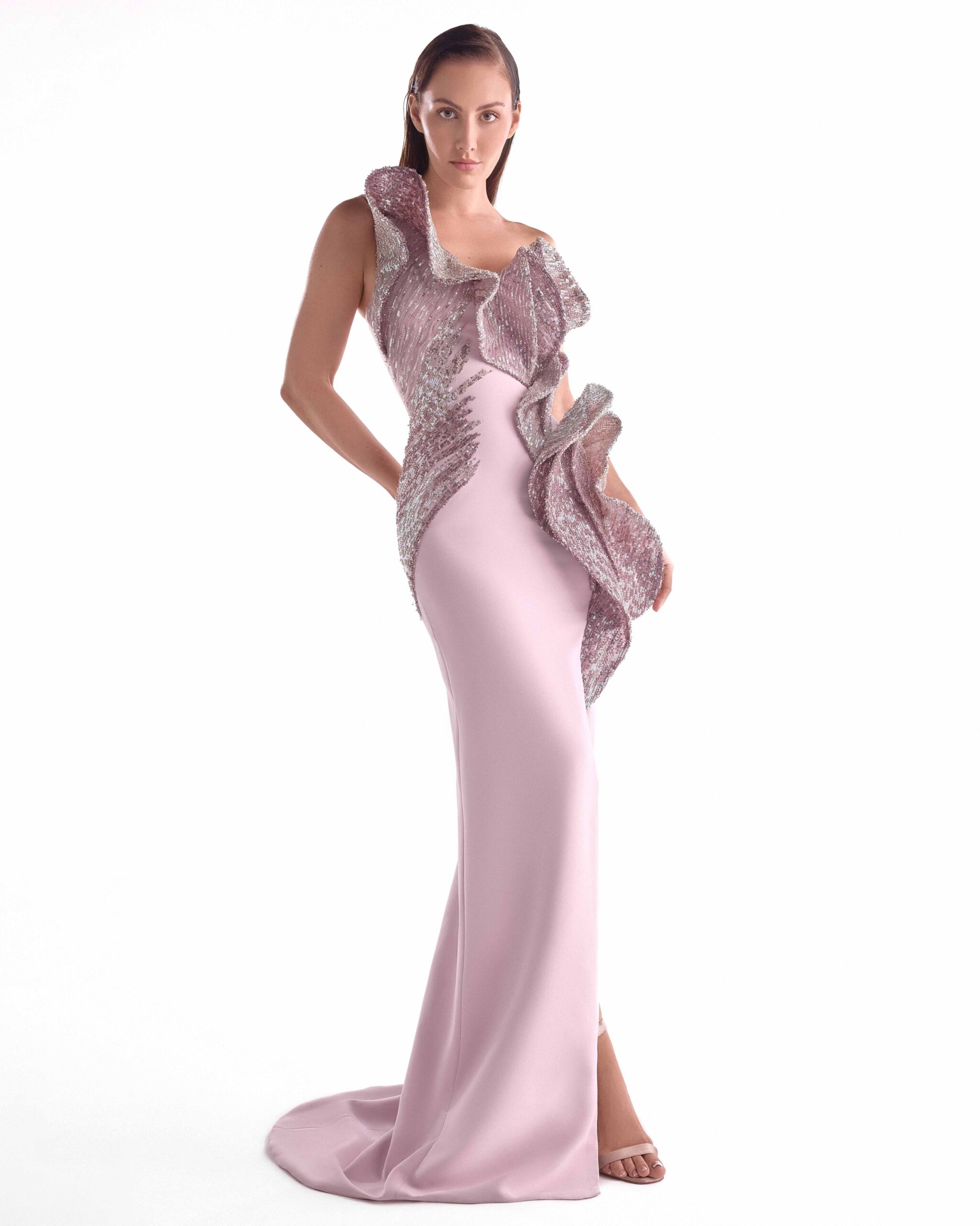 Dusty pink elegance unfolds through a sculpted silhouette crafted on a smooth crepe base. The one-shoulder design is elevated with intricately embellished appliqu?s that cascade across the bodice in fluid, sculptural motion. Textured detailing adds dimension and soft luminosity, creating a striking contrast against the clean lines of the gown. A fitted cut elongates the figure while allowing the embellishment to remain the focal point. Designed to feel refined yet expressive, the gown captures modern couture with a romantic edge.