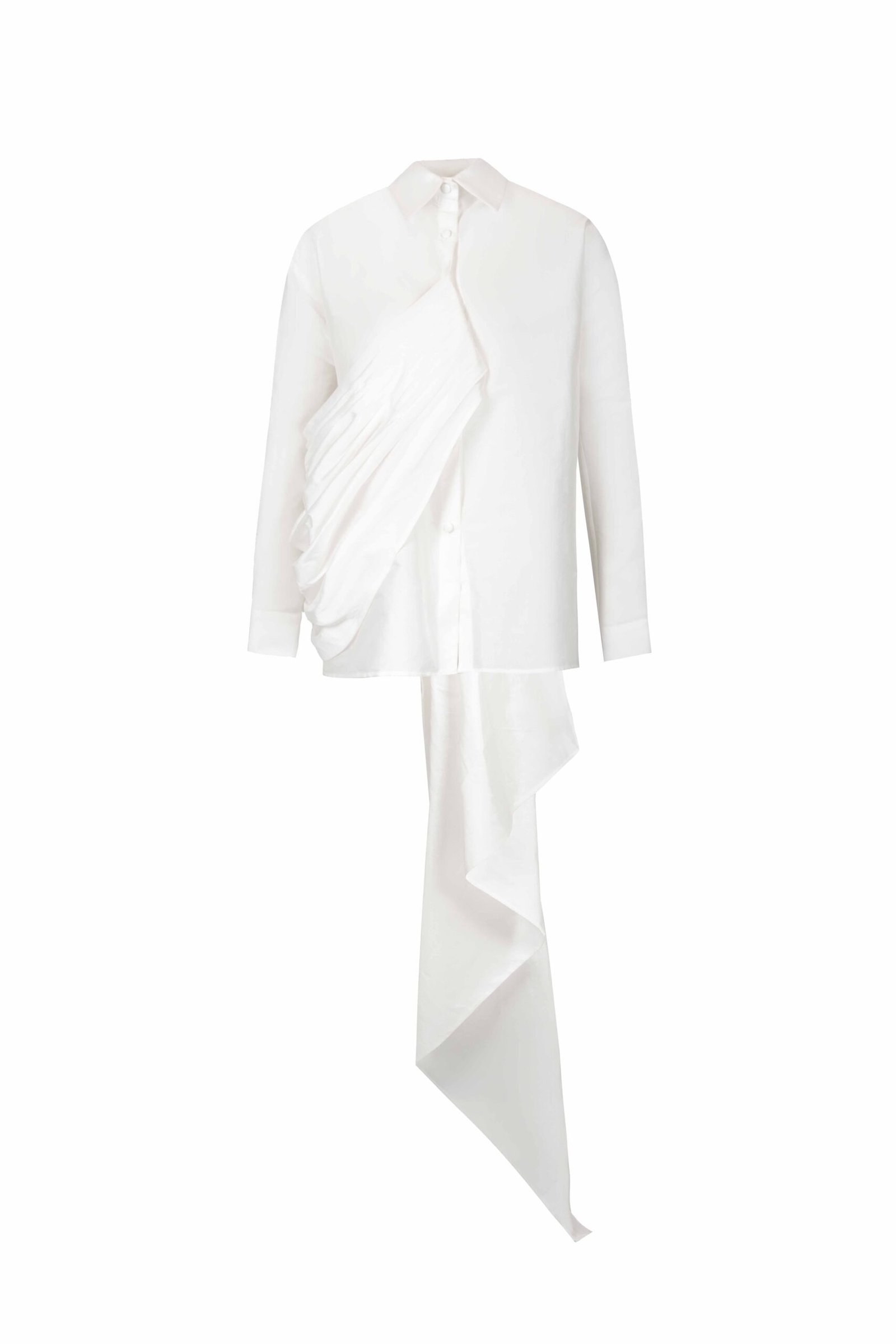 An ethereal off-white blouse crafted from taffeta and features a sculptural draped overlay that sweeps from the front across the shoulder and into a fluid train at the back. The classic shirt collar and tailored cuffs contrast beautifully with the soft movement of the draping, creating a striking interplay between structure and romance.