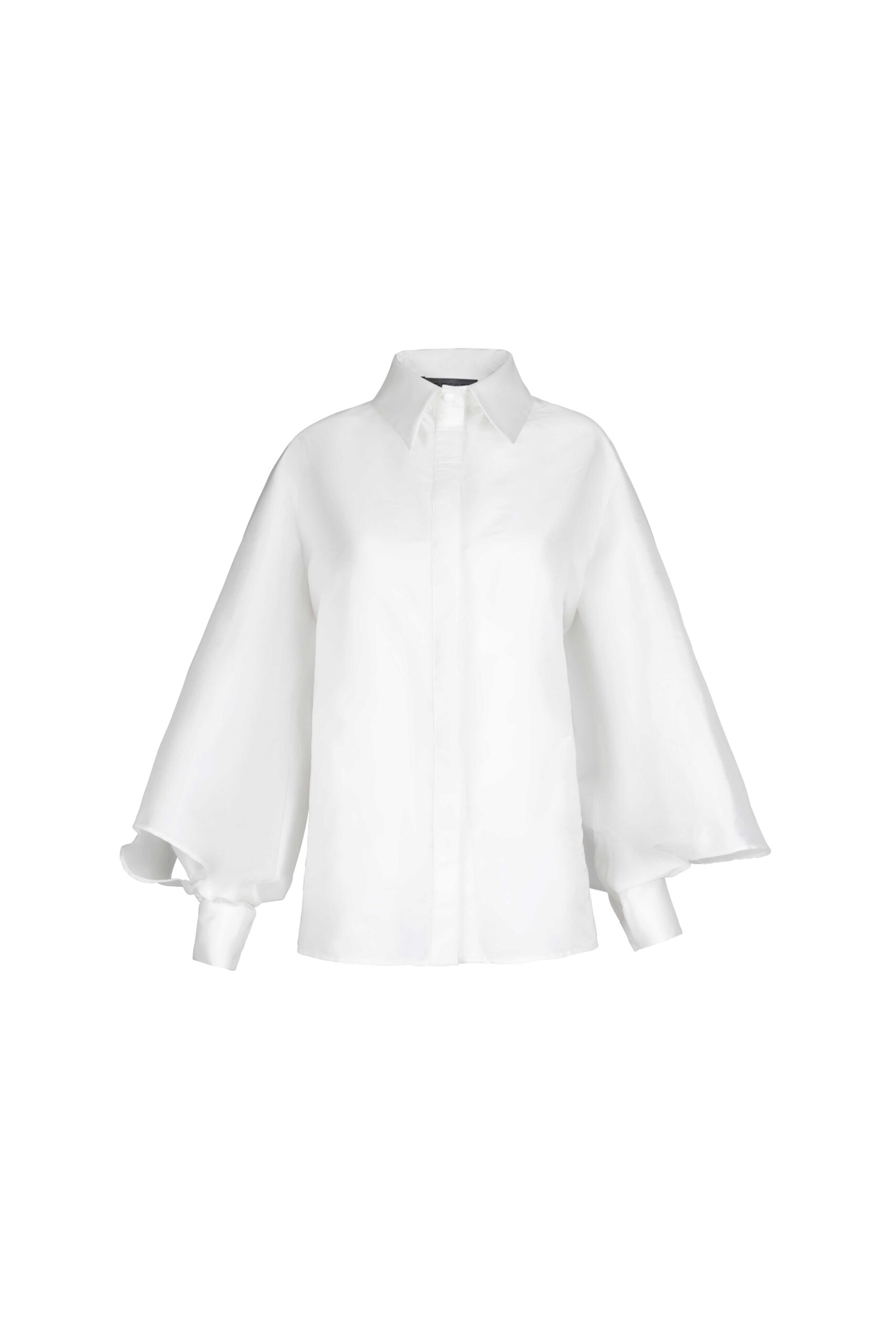 Dazzle in an Off-white taffeta blouse with soft volume and statement sleeves.